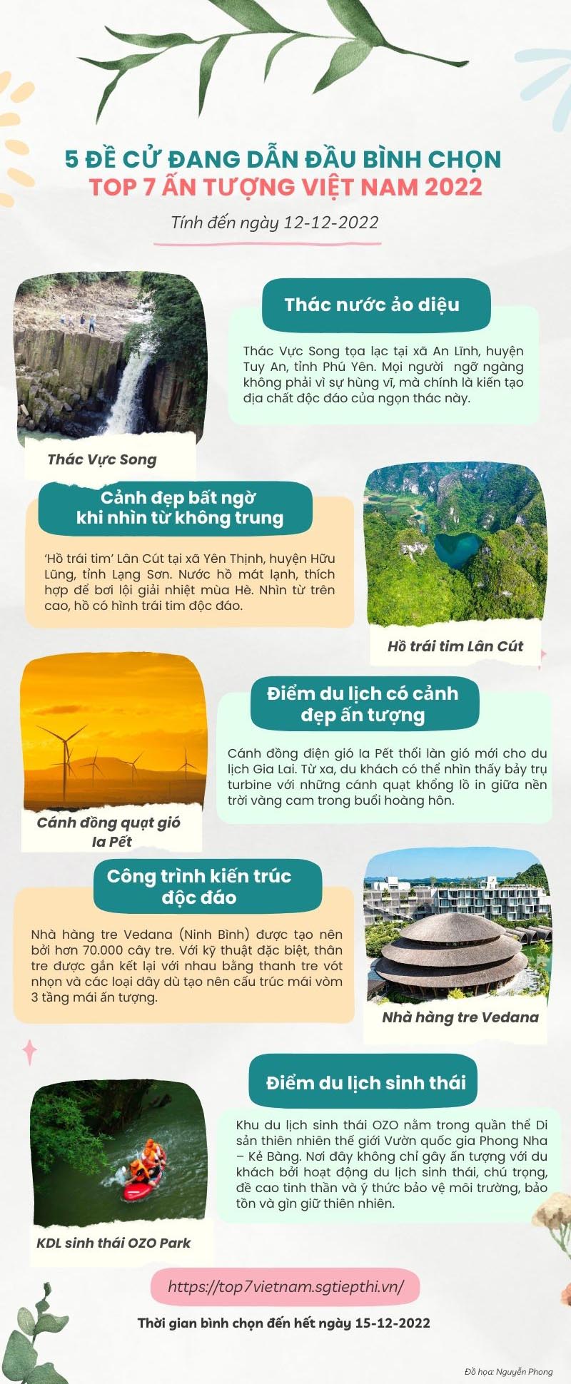 Bước vào những ngày cuối, cuộc bình chọn tìm ra “Top 7 Ấn tượng Việt Nam 2022” đang diễn ra vô cùng sôi nổi. Dưới đây là 5 điểm đến dẫn đầu ở các hạng mục mà Ban tổ chức ghi nhận đến ngày 12-12-2022.