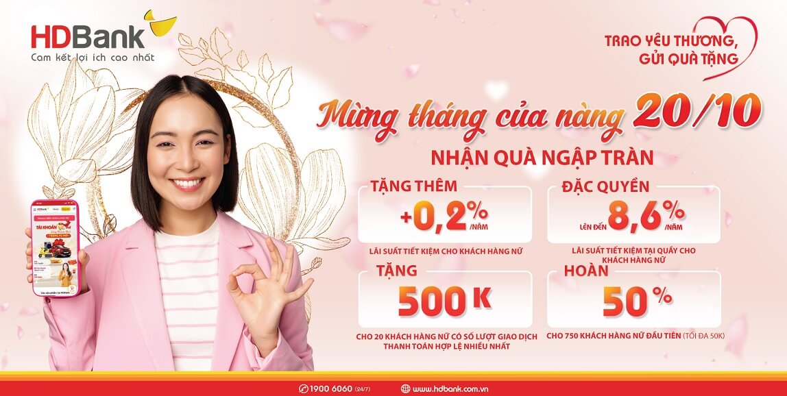 Cụ thể, đối với các khách hàng nữ mở mới tài khoản thanh toán e-SkyOne và sử dụng app HDBank để giao dịch trong ngày 20 và 21-10, HDBank sẽ hoàn 50% giá trị giao dịch  (tối đa 50 nghìn đồng) vào tài khoản thanh toán cho 750 khách hàng nữ đầu tiên phát sinh giao dịch thanh toán hợp lệ, tối thiểu 100 nghìn đồng mỗi ngày, trong khung giờ từ 08 giờ đến 23 giờ 59 phút.