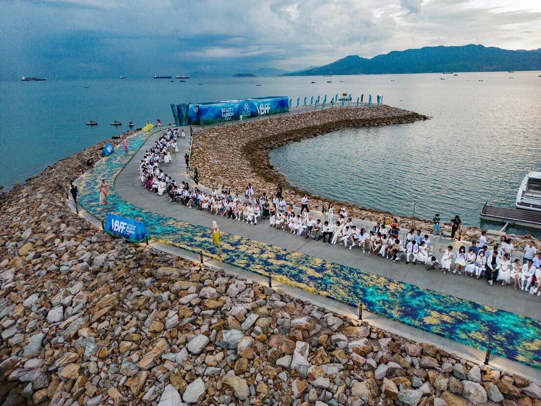 Chiếc cầu tàu uốn lượn từ khu vực Sales Gallery nối dài ra biển, khoác lên mình hình ảnh hoàn toàn khác biệt khi trở thành sàn catwalk chính với chiều dài hơn 300m của Vietnam Beauty Fashion Fest – sự kiện nằm trong khuôn khổ vòng chung kết Miss World Vietnam 2022.