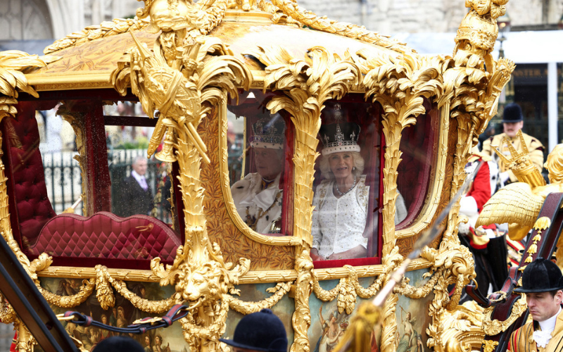 Vua Charles III và hoàng hậu ngồi Cỗ xe Gold State Coach – cỗ xe 260 tuổi đã được sử dụng trong mọi lễ đăng quang của quân vương Anh kể từ William IV năm 1831 để tham gia lễ diễu hành hay được gọi là “Lễ rước Đăng quang”.
