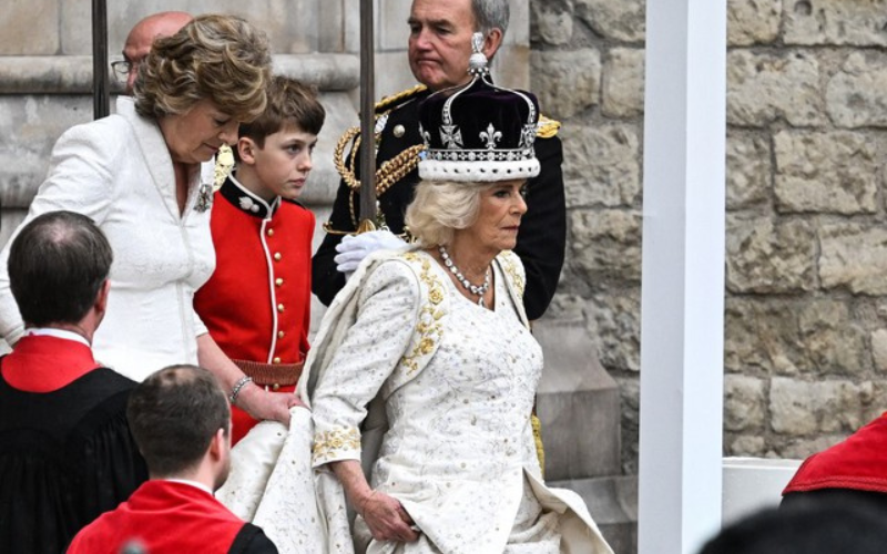 Hoàng hậu Camilla dự lễ đăng quang trong trang phục được thiết kế tỉ mỉ với tông chủ đạo là màu ngà, bạc và vàng. Bên cạnh đó, bà mang đôi giày được làm từ lụa tương tự như chất liệu may áo, được đóng bởi nhà thiết kế Anh Elliot Zed.