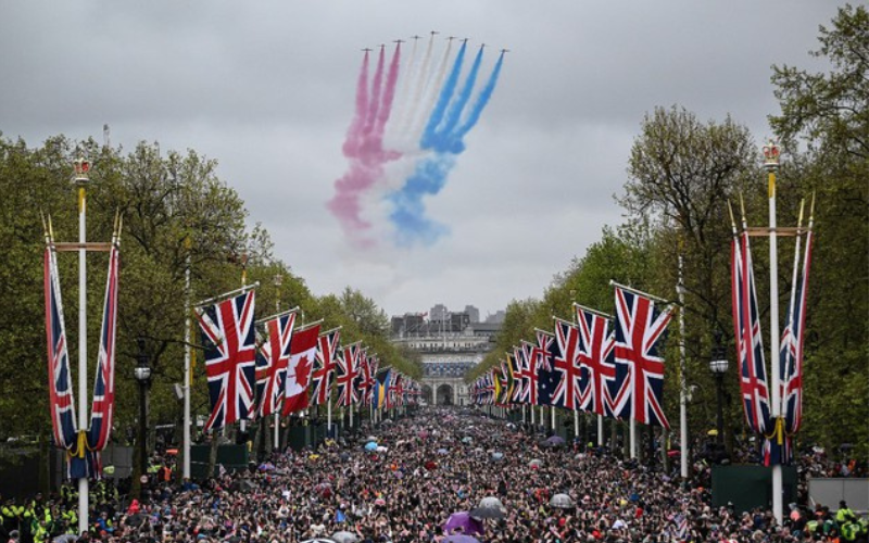 Lễ đăng quang không chỉ là cơ hội để Tân vương tìm kiếm và thể hiện sự đón nhận của dân chúng mà còn là dịp để người Anh thể hiện sự ủng hộ của họ đối với thể chế quốc gia. Bên cạnh sự hào nhoáng bên trong, ngoài đường phố cũng đầy hoành tráng bởi sự lấp đầy của khán giả với cờ hoa trong trang phục đỏ, trắng và xanh lam – màu cờ của Vương quốc Anh.
