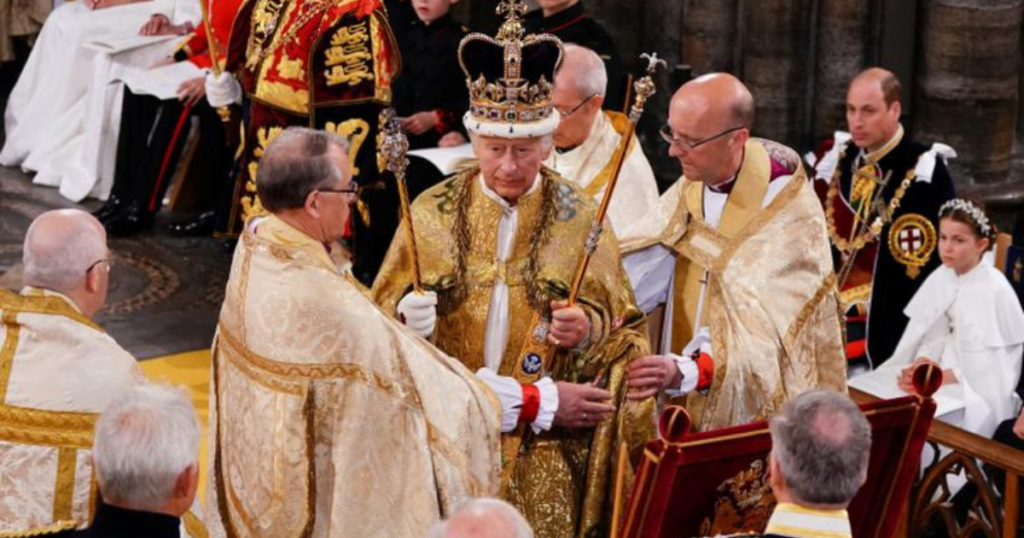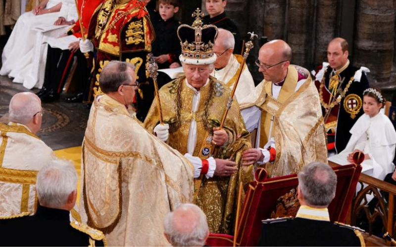 Sau khi Vua Charles III có lời tuyên thệ trước luật pháp cũng như Giáo hội Anh, Đức vua được Giám mục trưởng Justin Welby xức dầu và trao những bảo vật trong lễ đăng quang, trong đó bao gồm quả cầu và vương trượng – và được đội Vương miện Thánh Edwards lần đầu tiên lên đầu.
