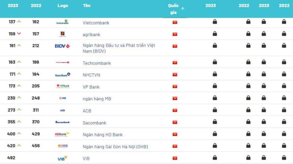 Như vậy, với 12 ngân hàng, Việt Nam đứng đầu khu vực ASEAN về số lượng nhà băng lọt Top 500. Tiếp theo là Indonesia và Philippines cùng có 9 ngân hàng, Malaysia (8 ngân hàng), Thái Lan (6 ngân hàng) và Singapore (3 ngân hàng). Bên cạnh đó, các ngân hàng Việt Nam cũng dẫn đầu ASEAN về tổng số hạng được thăng, cụ thể: 12 ngân hàng Việt Nam thăng được 296 hạng, tiếp theo là Indonesia thăng 79 hạng, Singapore thăng 20 hạng, trong khi Thái Lan tụt 25 hạng, Malaysia tụt 56 hạng, Philippines tụt 80 hạng.