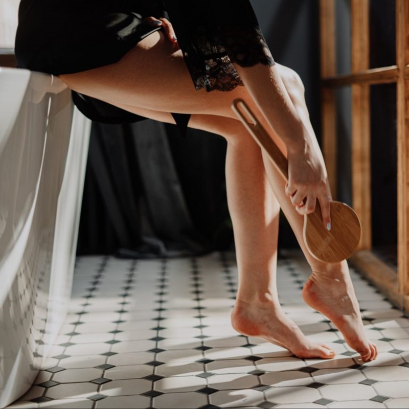 Khi da tiếp xúc quá lâu với nước, lớp màng hydrolipid yếu đi làm làn da trở nên sần sùi, mất nước và nhạy cảm hơn. Do đó, bạn thực hiện bước tẩy tế bào chết trước khi tắm với nước ấm để giảm kích ứng da. Sử dụng các hoạt chất hóa học AHA/BHA để loại bỏ lớp sừng dịu nhẹ hoặc massage da bằng sản phẩm chứa các hạt muối biển mịn nếu bạn muốn tận hưởng cảm giác sảng khoái. Bàn chải khô cũng là một công cụ đắc lực khác để tẩy đi lớp da chết sần sùi và cải thiện lưu thông máu giúp da hồng hào hơn.