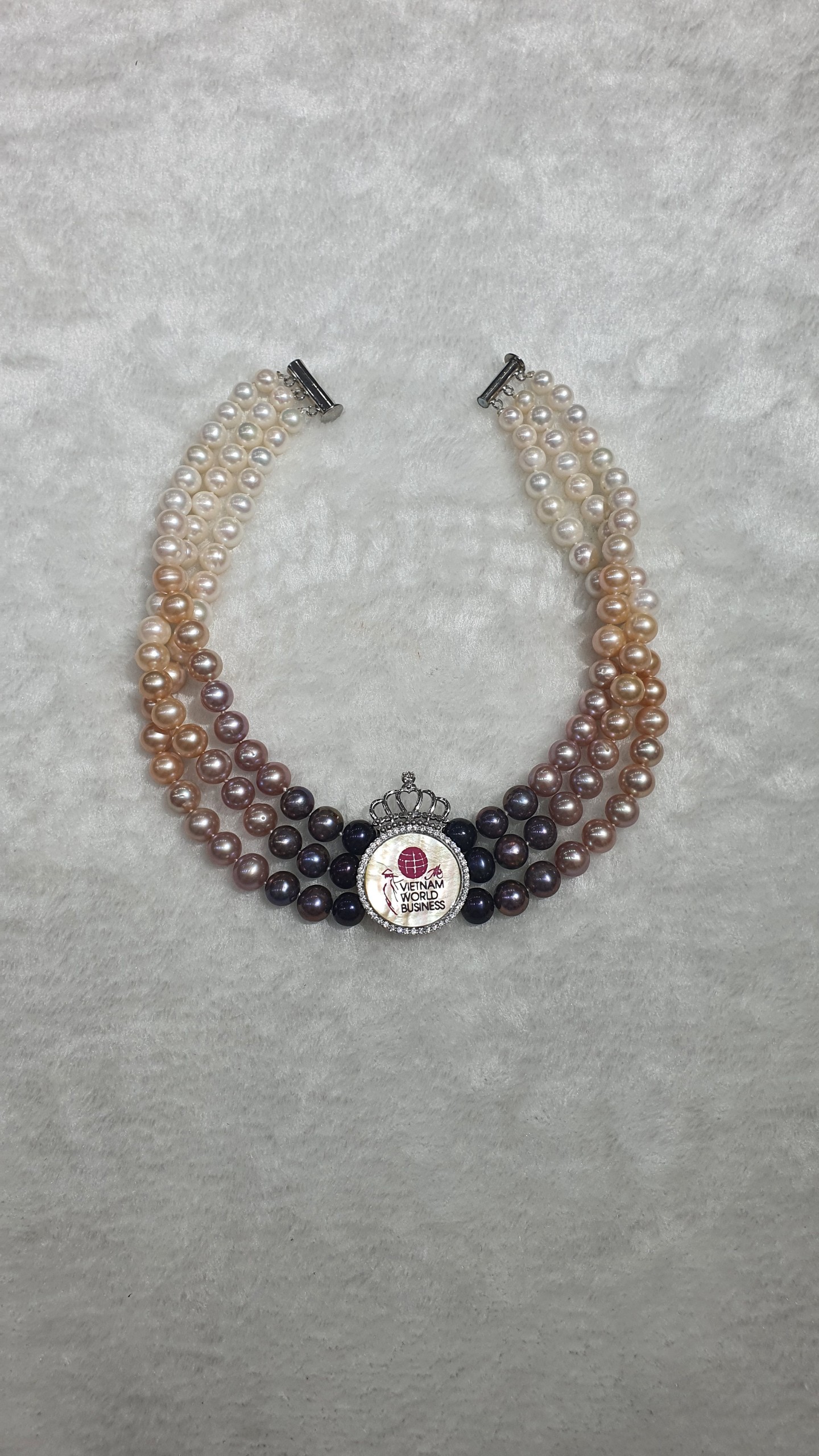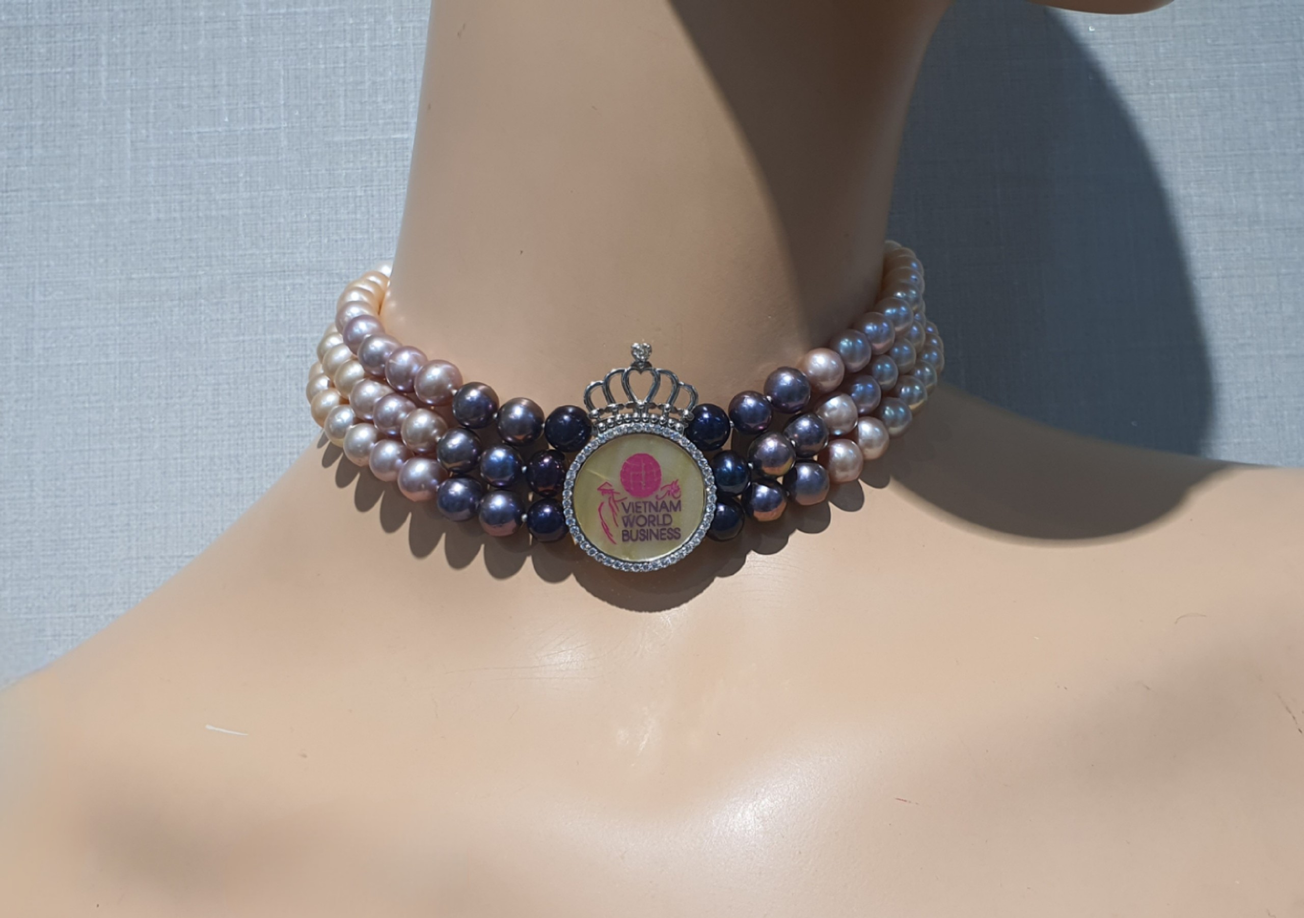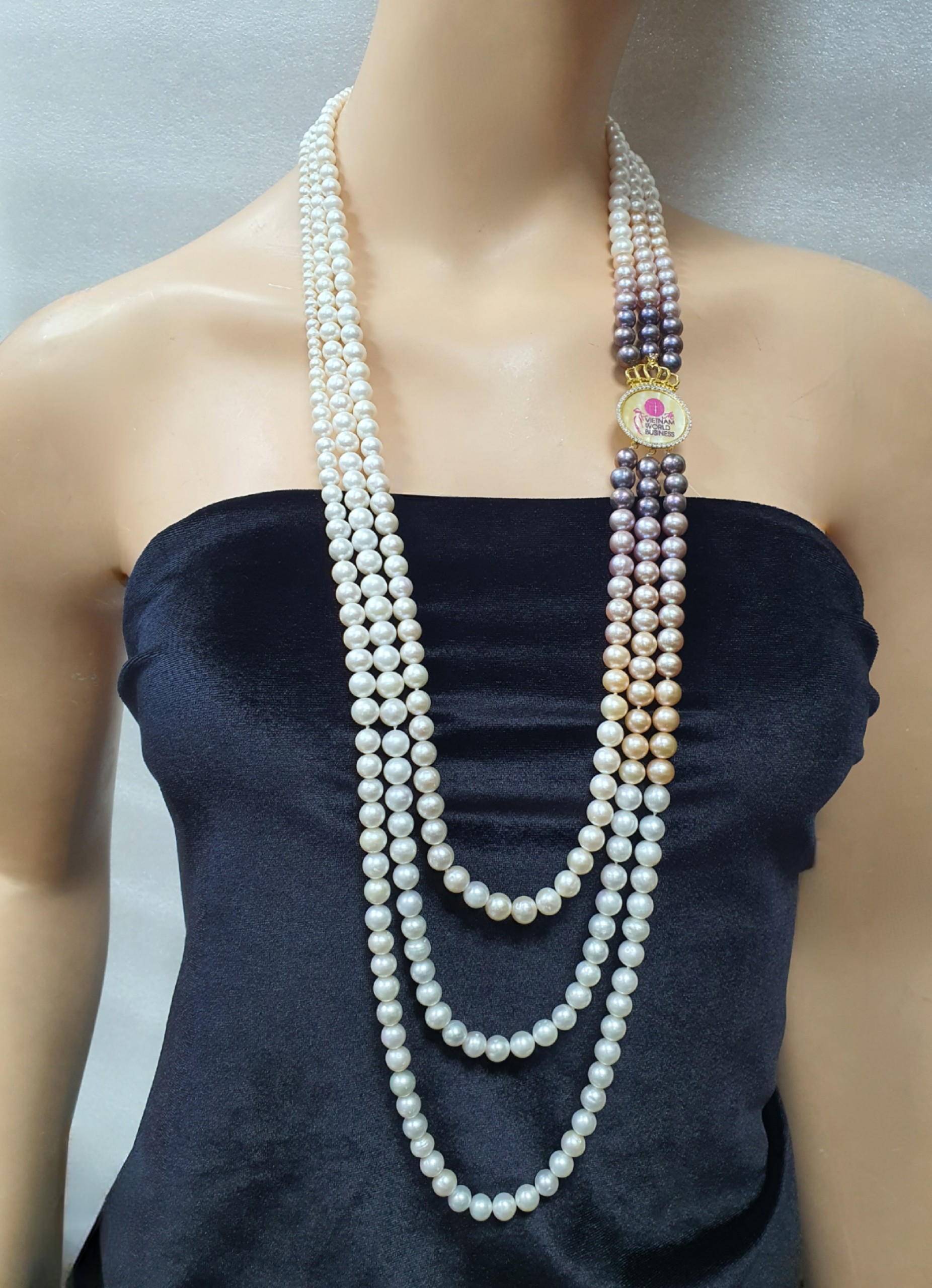 Chuỗi Ngọc trai đa tầng “Miss World”, chuyển màu dần từ sáng sang tối, mặt thiết kế hình Vương miện bằng vàng cẩn đá quý và kim cương có khắc biểu tượng Logo của cuộc thi.