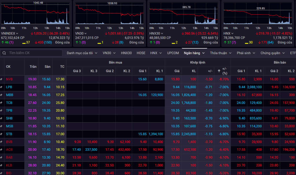 Cổ phiếu ngân hàng liên tục giảm sàn, VN-Index giảm mạnh