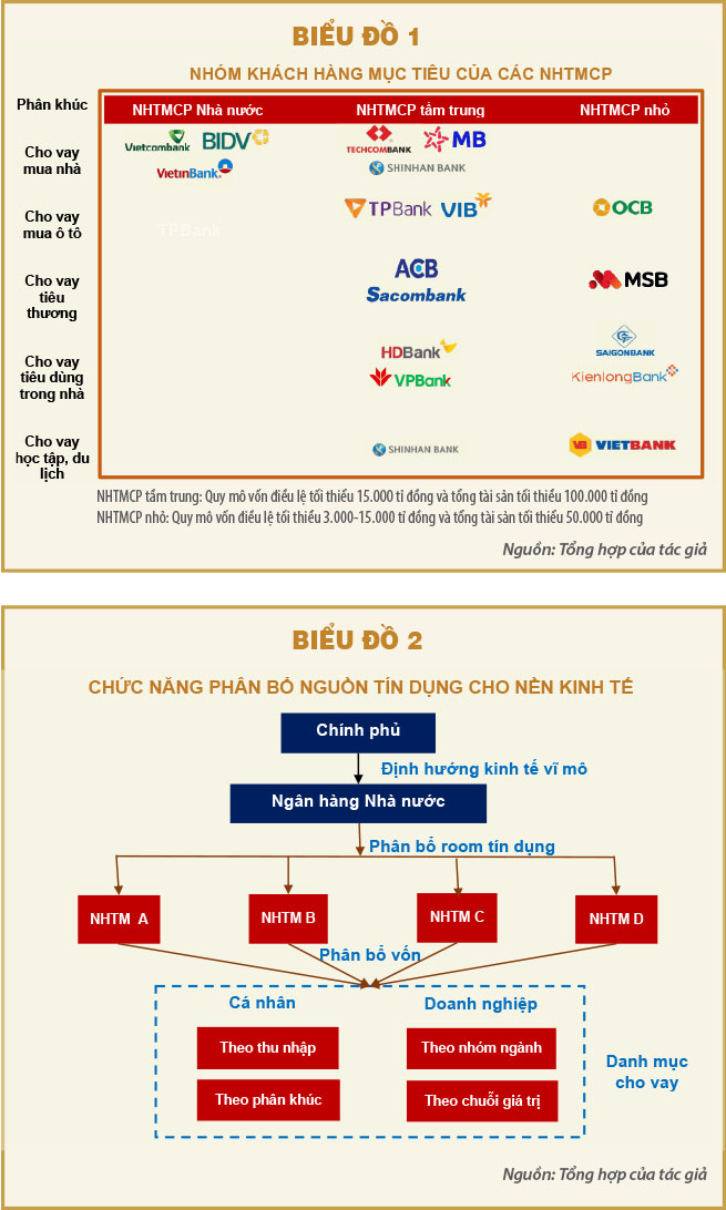 Nhìn vào biểu đồ 1 chúng ta có thể thấy được tập khách hàng mục tiêu của từng nhóm ngân hàng thương mại. Các ngân hàng lớn được lợi thế về lãi suất, nhưng các ngân hàng nhỏ vẫn có nhiều cơ hội tăng trưởng nếu lựa chọn được phân khúc khách hàng phù hợp.