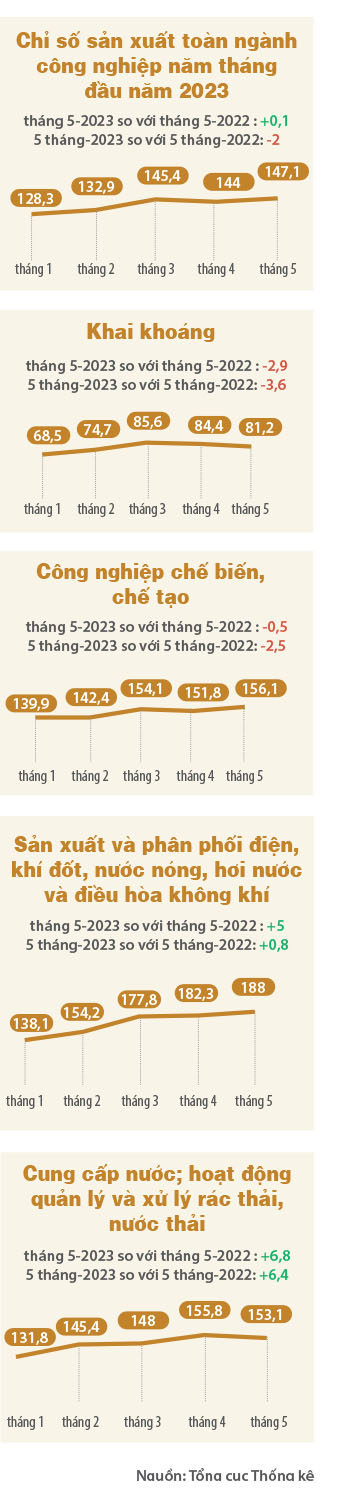 Báo cáo của Tổng cục Thống kê cho thấy tình hình sản xuất công nghiệp vẫn đang ở tình trạng suy giảm khi chỉ số sản xuất công nghiệp (IIP) trong năm tháng đầu năm 2023 giảm 2 điểm so với cùng kỳ 2022. Trong đó, ngành chế biến, chế tạo – đóng góp khoảng một phần tư vào GDP – đang chứng kiến xu hướng sụt giảm khá mạnh (tháng 5 giảm 0,5 điểm so với cùng kỳ 2022 và năm tháng đầu năm 2023 giảm 2,5 điểm so với cùng kỳ 2022).