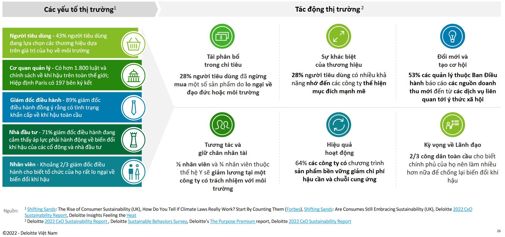 Theo báo cáo “Phát triển bền vững CxO của Deloitte 2022: Khoảng cách giữa tham vọng và hành động”, các nhà lãnh đạo doanh nghiệp cấp cao trên toàn cầu ngày càng quan ngại đến tác động của biến đổi khí hậu nhưng thách thức là lồng ghép yếu tố bền vững này vào hoạt động của doanh nghiệp.