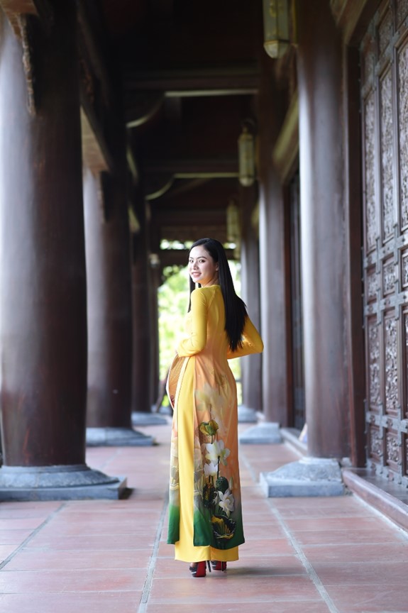 Doanh nhân Phương Linh ( giám đốc công ty EOTI GROUP ) thả dáng thơ mộng với chiếc áo dài truyền thống đơn giản mà thanh lịch.