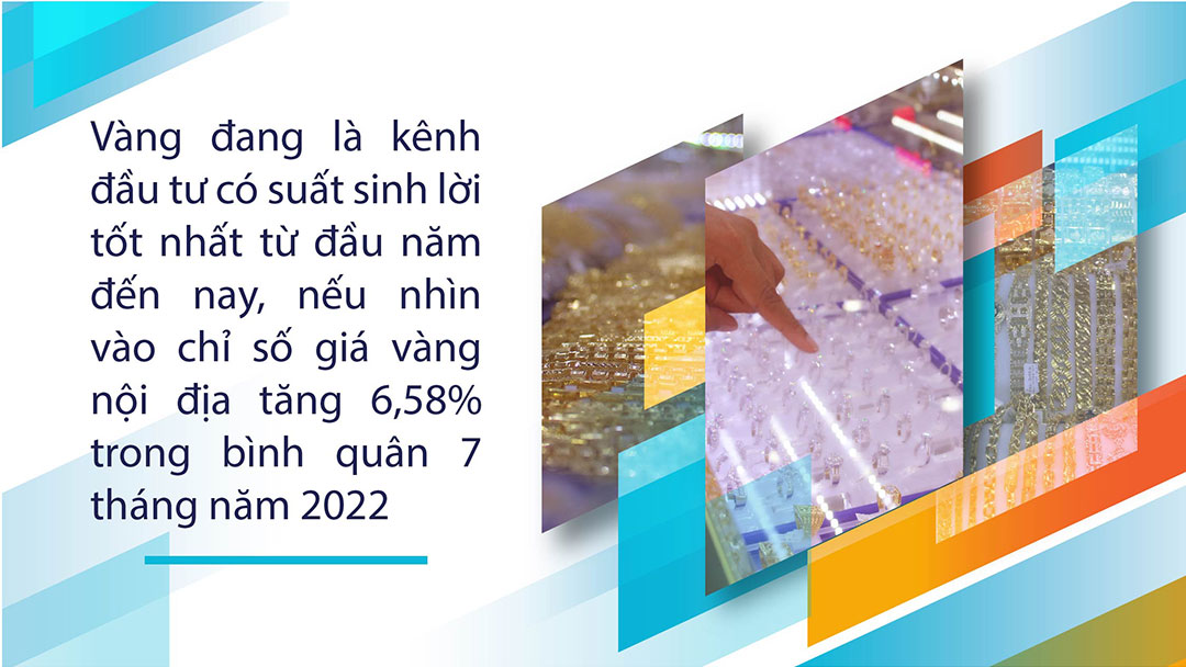 Thống kê chung cũng cho thấy vàng đang là kênh đầu tư có suất sinh lời tốt nhất từ đầu năm đến nay, nếu nhìn vào chỉ số giá vàng nội địa tăng 6,58% trong bình quân 7 tháng năm 2022, theo số liệu của Tổng cục Thống kê.