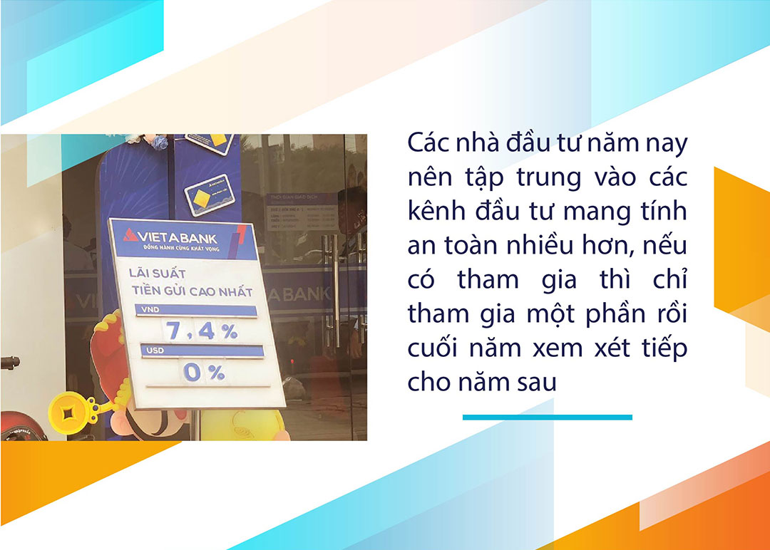Theo quan sát của ông Khánh, hiện dòng tiền vẫn đổ vào chứng khoán nhưng tỷ lệ cũng không cao, tính thanh khoản giảm, trong khi thị trường bất động sản cũng đã phát tín hiệu giảm so với năm ngoái. Vì vậy, ông Khánh khuyến nghị các nhà đầu tư năm nay nên tập trung vào các kênh đầu tư mang tính an toàn nhiều hơn, nếu có tham gia thì chỉ tham gia một phần rồi cuối năm xem xét tiếp cho năm sau.