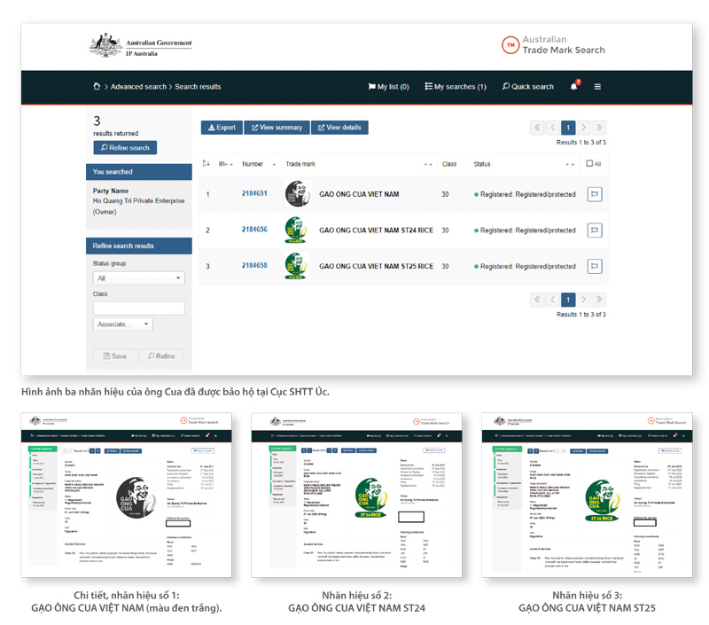 (KTSG) – Thông tin từ dữ liệu của Cục Sở hữu trí tuệ Úc (IP Úc), ba nhãn hiệu GẠO ÔNG CUA ST24, ST25 của kỹ sư Hồ Quang Cua (Doanh nghiệp tư nhân Hồ Quang Trí) đăng ký cho nhóm 30 là gạo đã chính thức được cấp văn bằng bảo hộ nhãn hiệu tại Úc.