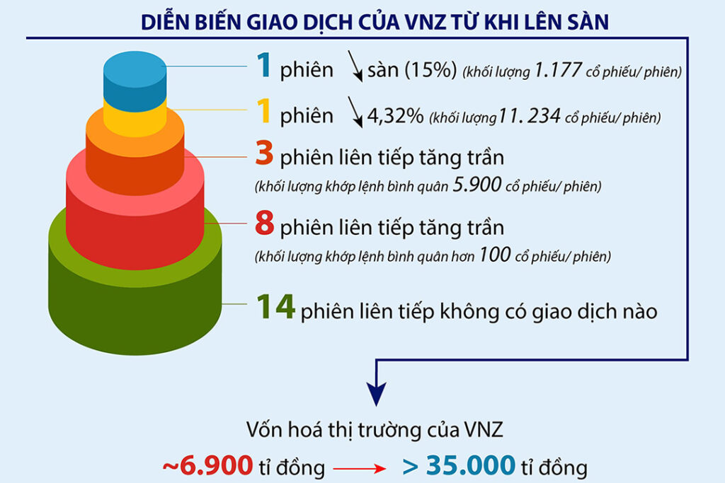 Sau phiên giao dịch ngày 17-2, cổ phiếu VNZ (niêm yết sàn UPCoM) đã giảm sàn (mức 15%), nối tiếp phiên giảm 4,32% trong phiên giao dịch liền trước, đồng thời chính thức phá chuỗi tăng trần 13 phiên liên tiếp kể từ khi niêm yết trên sàn UPCoM ngày 5-1-2023.
