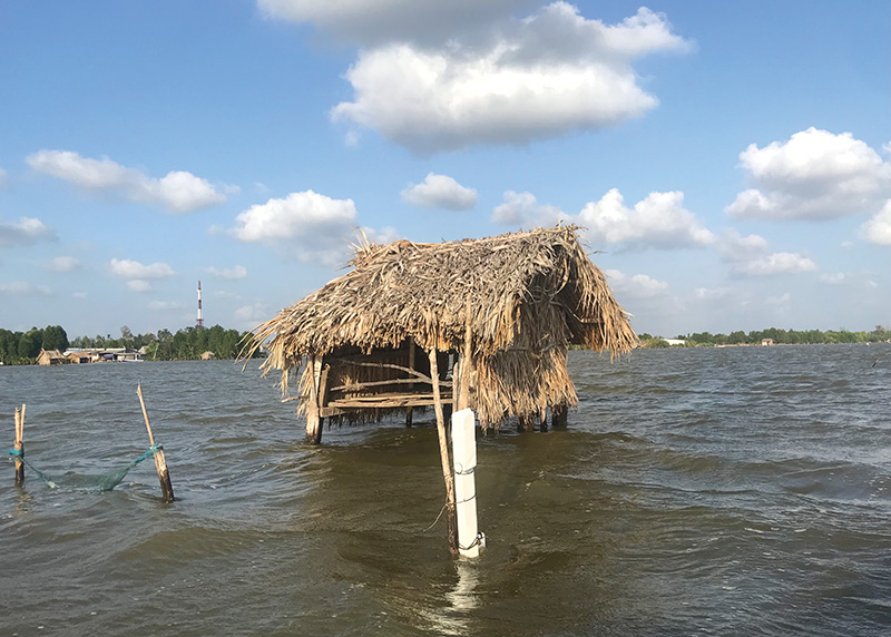 Tàu hướng ra ngôi nhà lớn giữa đầm. Nhà có sàn cầu phía trước và cả một hàng chậu hoa giấy đỏ. Đó là thứ có màu sắc tươi sáng duy nhất ở đây. Sàn nhà bằng ván đước, được bào nhẵn, lau sạch. Bốn bề là song cửa cho gió lùa. Lúc mưa tạt hay nắng chói thì sập rèm xuống. Dưới sàn nhà, nước cứ vỗ ì oạp suốt ngày đêm.