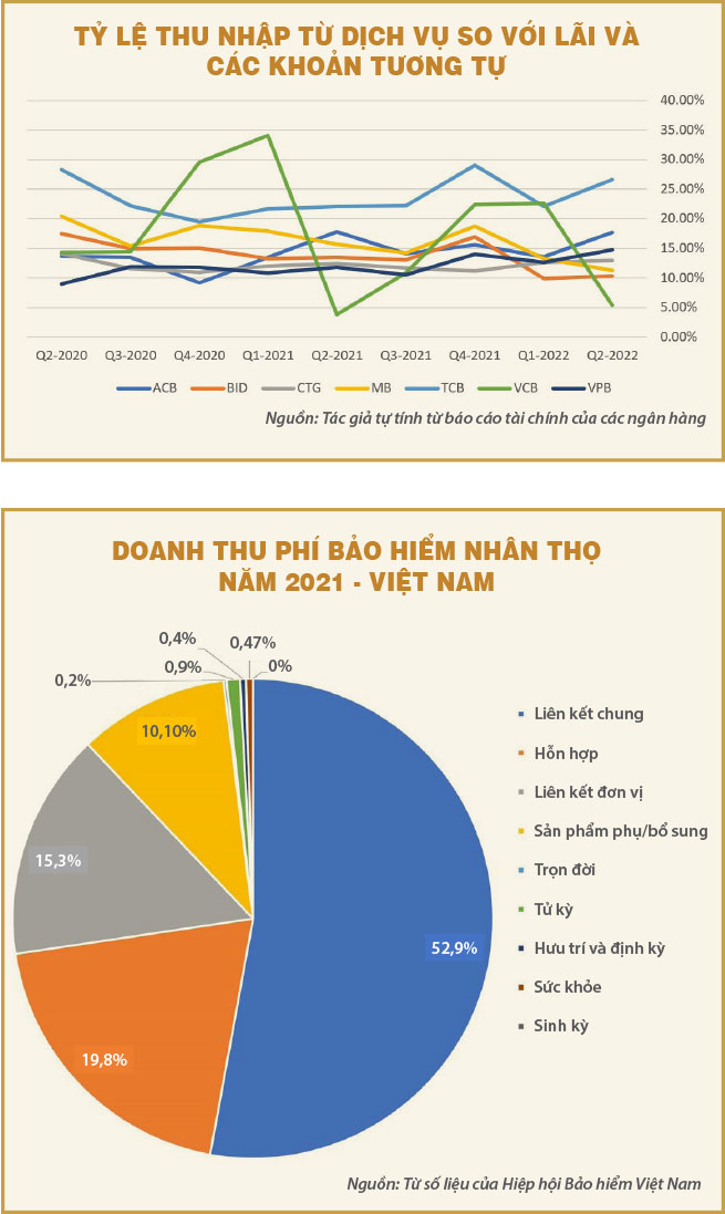 Doanh thu từ dịch vụ bảo hiểm đã mang lại cho nhiều ngân hàng một nguồn thu đáng kể, và đóng góp này còn quan trọng hơn với một số ngân hàng trong bối cảnh room tín dụng đã cạn. Trong sáu tháng đầu năm 2022, một số ngân hàng có doanh thu từ dịch vụ bảo hiểm cao, lên đến trăm tỉ ngàn tỉ đồng. Chẳng hạn như ghi nhận ở Ngân hàng MB là hơn 5.000 tỉ đồng, VPBank là hơn 1.500 tỉ đồng, TCB là hơn 600 tỉ đồng và VIB gần 600 tỉ đồng.