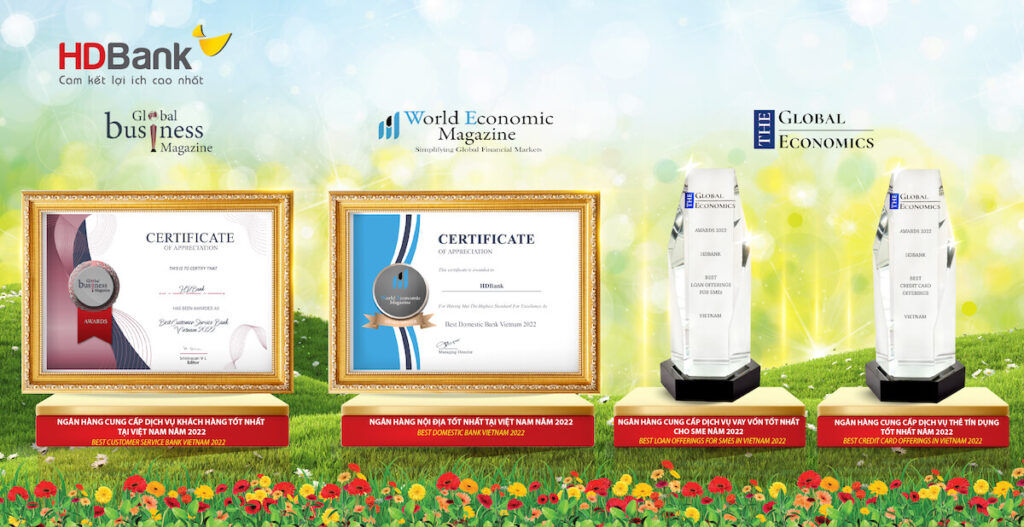 Theo đó, HDBank đã nhận được 3 giải đánh giá về chất lượng dịch vụ, gồm: “Ngân hàng cung cấp dịch vụ vay vốn tốt nhất cho SME năm 2022” (Best loan offerings for SMEs in Vietnam 2022), “Ngân hàng cung cấp dịch vụ thẻ tín dụng tốt nhất năm 2022” (Best credit card offerings in Vietnam 2022), “Ngân hàng cung cấp dịch vụ khách hàng tốt nhất tại Việt Nam năm 2022” (Best Customer Service Bank Vietnam 2022) do Tạp chí The Global Economics tại Anh, Tạp chí Global Business Magazine LLC tại Các tiểu vương quốc Ả Rập thống nhất trao tặng.
