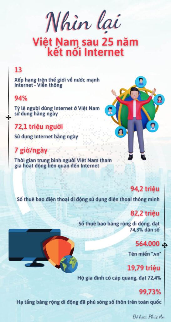 (SGTT) – Sau 25 năm tham gia kết nối Internet, Việt Nam đã đạt được nhiều thành tựu về viễn thông cũng như mạng Internet. Theo số liệu thống kê của Bộ Thông tin và Truyền thông, trung bình mỗi ngày có khoảng 72,1 triệu người sử dụng Internet.