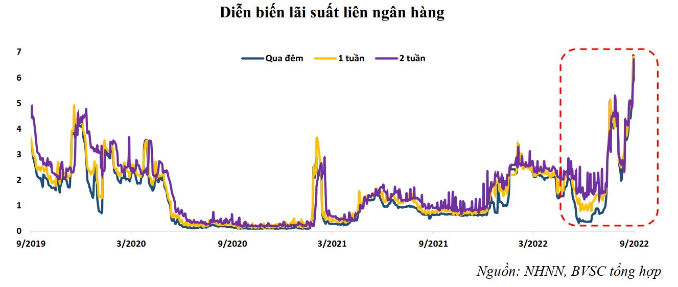 Các chuyên gia cũng nhận định lãi suất liên ngân hàng sẽ khó mà giữ ở mức thấp trong thời gian tới. “NHNN cần duy trì chênh lệch dương giữ lãi suất tiền đô và tiền đồng liên ngân hàng để hỗ trợ tỷ giá và nhu cầu tín dụng gia tăng phê duyệt hạn mức tín dụng còn lại. Chúng tôi kỳ vọng rằng lãi suất liên ngân hàng sẽ duy trì mức cao hiện tại trong những tháng sắp tới của năm 2022”, báo cáo của ABCS nhận định.