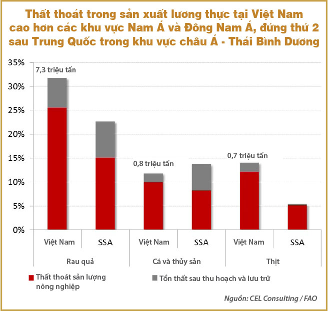 Dữ liệu của CEL Consulting cho thấy, tỷ lệ thất thoát ở nhóm rau quả là cao nhất, khoảng 32% sản lượng, tương đương với khoảng 7,3 triệu tấn rau quả bị thất thoát mỗi năm. Đối với ngành thịt, tỷ lệ thất thoát lên tới 14%, tương đương khoảng 694.000 tấn mỗi năm. Nhóm cá và thủy sản có tỷ lệ thất thoát khoảng 12% sản lượng, tương đương 804.000 tấn mỗi năm.