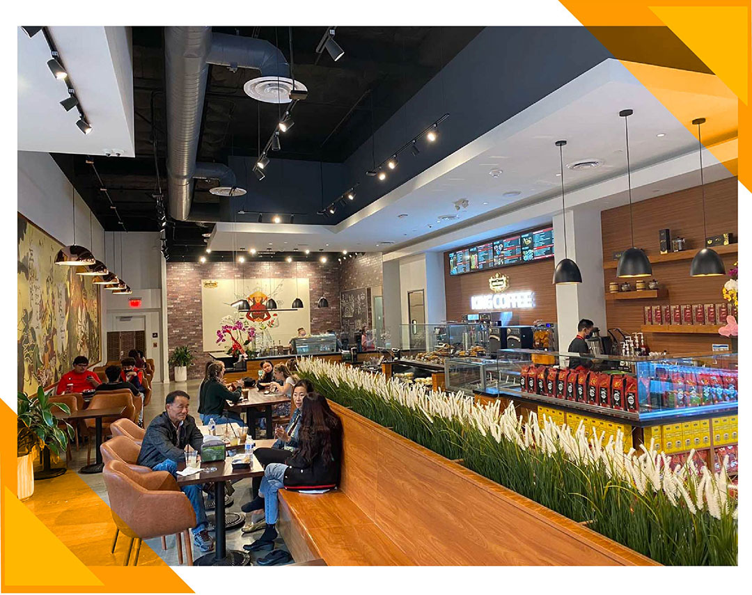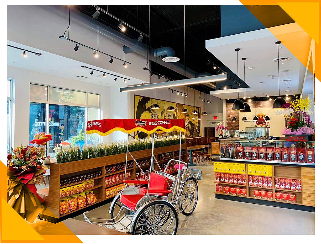 Nằm trong khu vực sầm uất Anaheim GardenWalk – trung tâm mua sắm và giải trí ngoài trời phía đông của Disney Resort với rất nhiều nhà hàng và cửa hiệu lớn, cách 10 phút đi bộ đến công viên Disney, King Coffee phục vụ đầy đủ các loại cà phê truyền thống của Việt Nam, như cà phê phin, cà phê đá, cà phê sữa đá…. Đặc biệt, quán cũng phục vụ phở và bánh mì của Việt Nam, mang lại trải nghiệm thật sự độc đáo tại bang California.