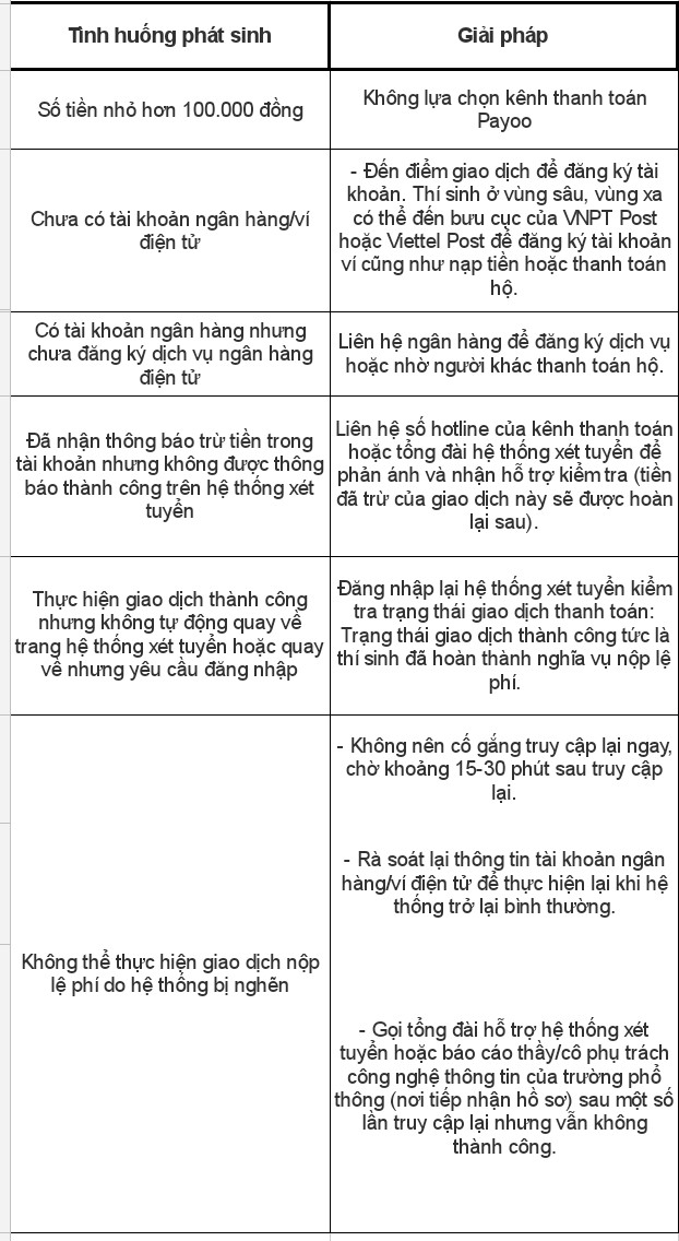 Quá trình thanh toán trực tuyến phụ thuộc việc kết nối nhiều hệ thống khác nhau nên thí sinh có thể gặp tình huống tắc nghẽn hệ thống. Khi đó, thí sinh không nên cố gắng truy cập lại ngay, chờ khoảng 30 phút sau thực hiện lại.