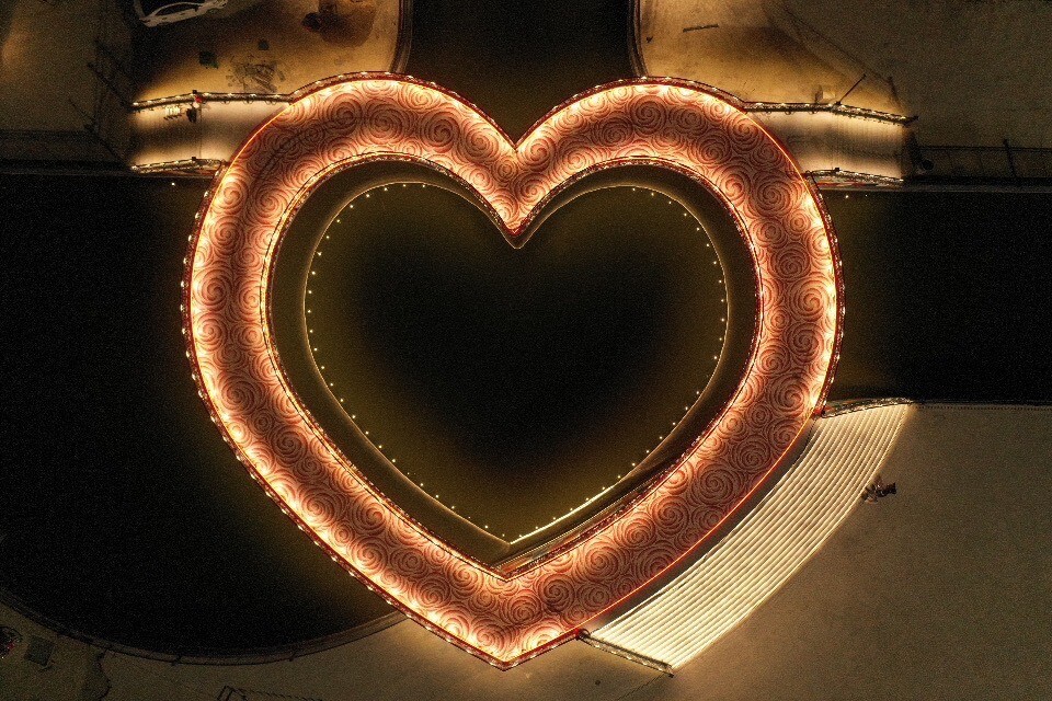 Không dừng lại ở đó, MerryLand Quy Nhơn còn bổ sung vào bộ sưu tập những công trình kiến trúc độc đáo với cầu trái tim họa tiết hoa hồng vừa ra mắt. Nhìn từ trên cao, cây cầu như nở rộ hàng ngàn đóa hồng đỏ thắm đan cài vào nhau đầy cuốn hút.