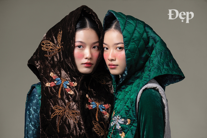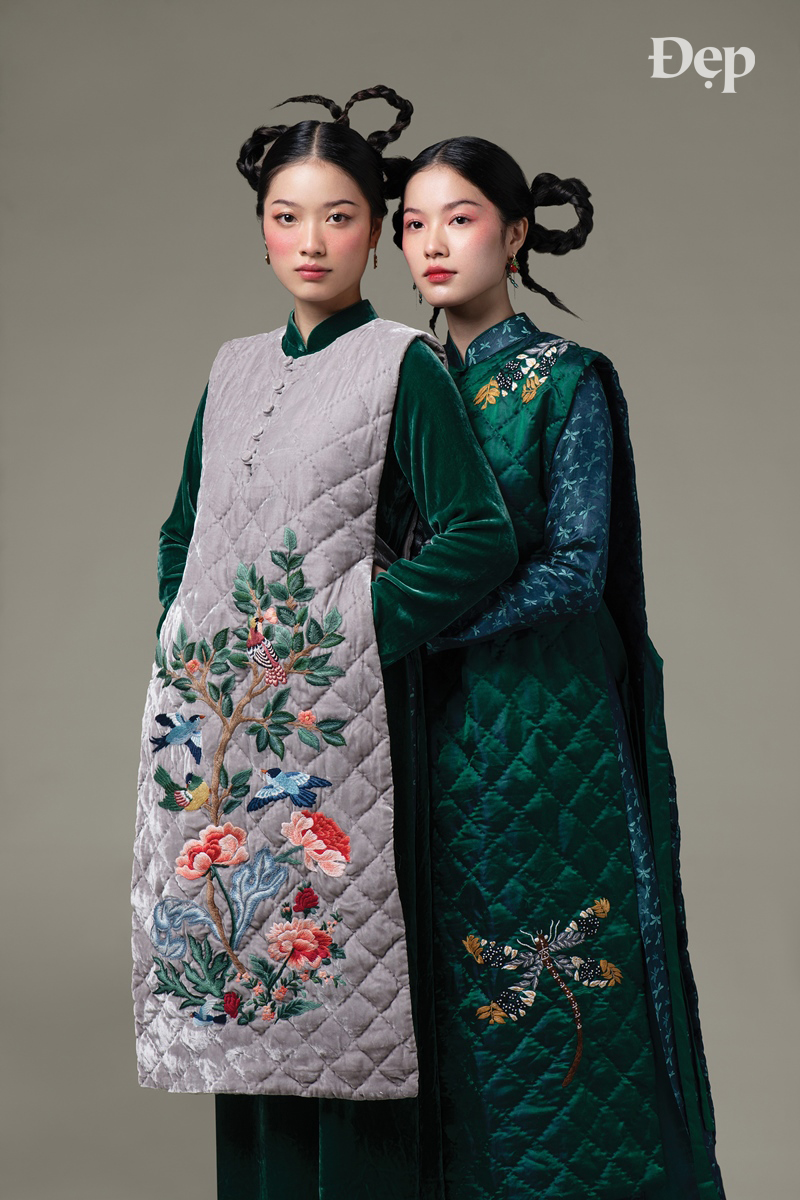 Vẻ đẹp truyền thống của chiếc áo dài thêu hoa, chiếc khăn mỏ quạ nhung gấm… giao thoa hài hòa cùng những rung cảm đương đại trên mái tóc vấn được biến tấu cùng những chấm tàn nhang mang âm hưởng phương Tây hay đường kẻ mắt pastel thanh mảnh mà người thiếu nữ tô điểm lên mình ngày xuân.