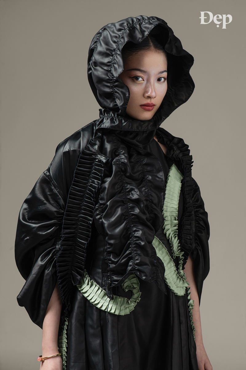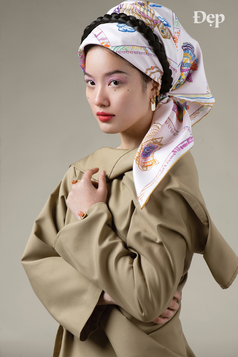 Trang phục: N24 Lab – Khuyên tai, khăn lụa: Hermès – Vòng tay, nhẫn: Hanoia