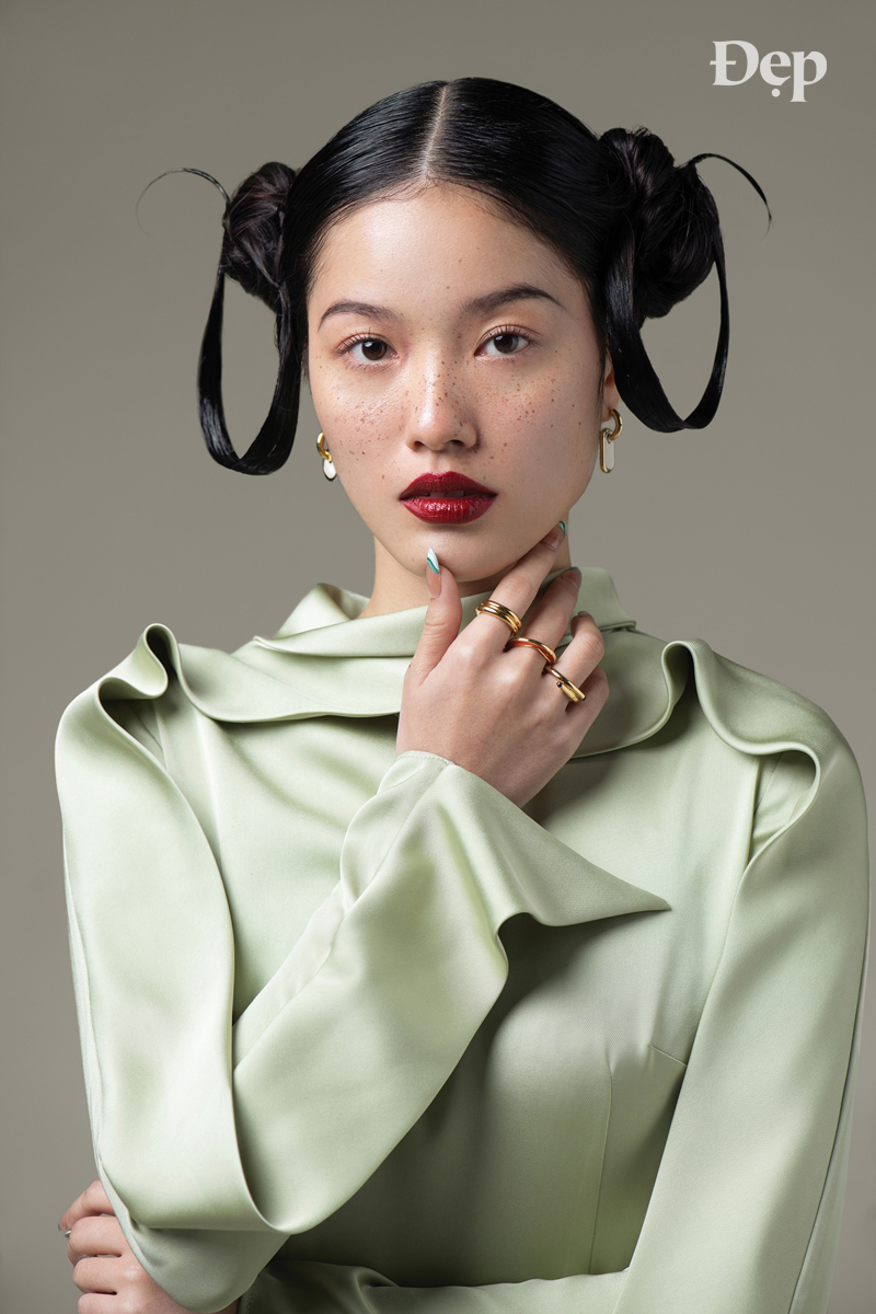 Những đốm tàn nhang là dấu ấn trang điểm của thời đại mới trong khi kiểu tóc ép nếp ngôi giữa và đôi lông mày cong vút thanh mảnh gợi nhắc đến vẻ đẹp của những người phụ nữ truyền thống. Hai dòng chảy thời gian được đan cài một cách hài hòa. Trang phục: Perma – Trang sức: Hanoia