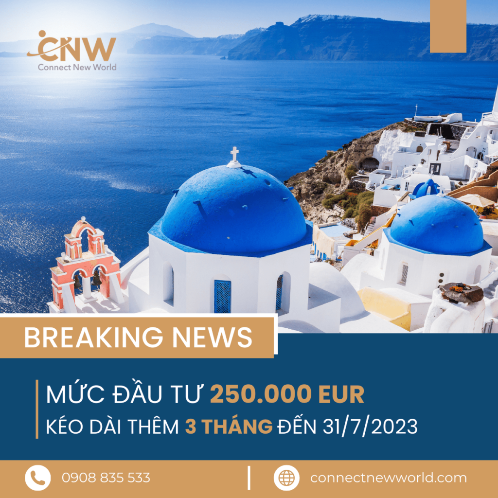Ngày 31/03/2023, Quốc Hội Hy Lạp bỏ phiếu và chính thức kéo dài khoảng thời gian áp dụng mức đầu tư cũ là 250.000 EUR đến hết ngày 31/07/2023. Cùng CNW cập nhật những thay đổi mới nhất của chương trình Thị Thực Vàng Hy Lạp năm 2023 và nắm bắt cơ hội định cư Hy Lạp, lấy quyền thường trú nhân Châu Âu cho cả gia đình.
