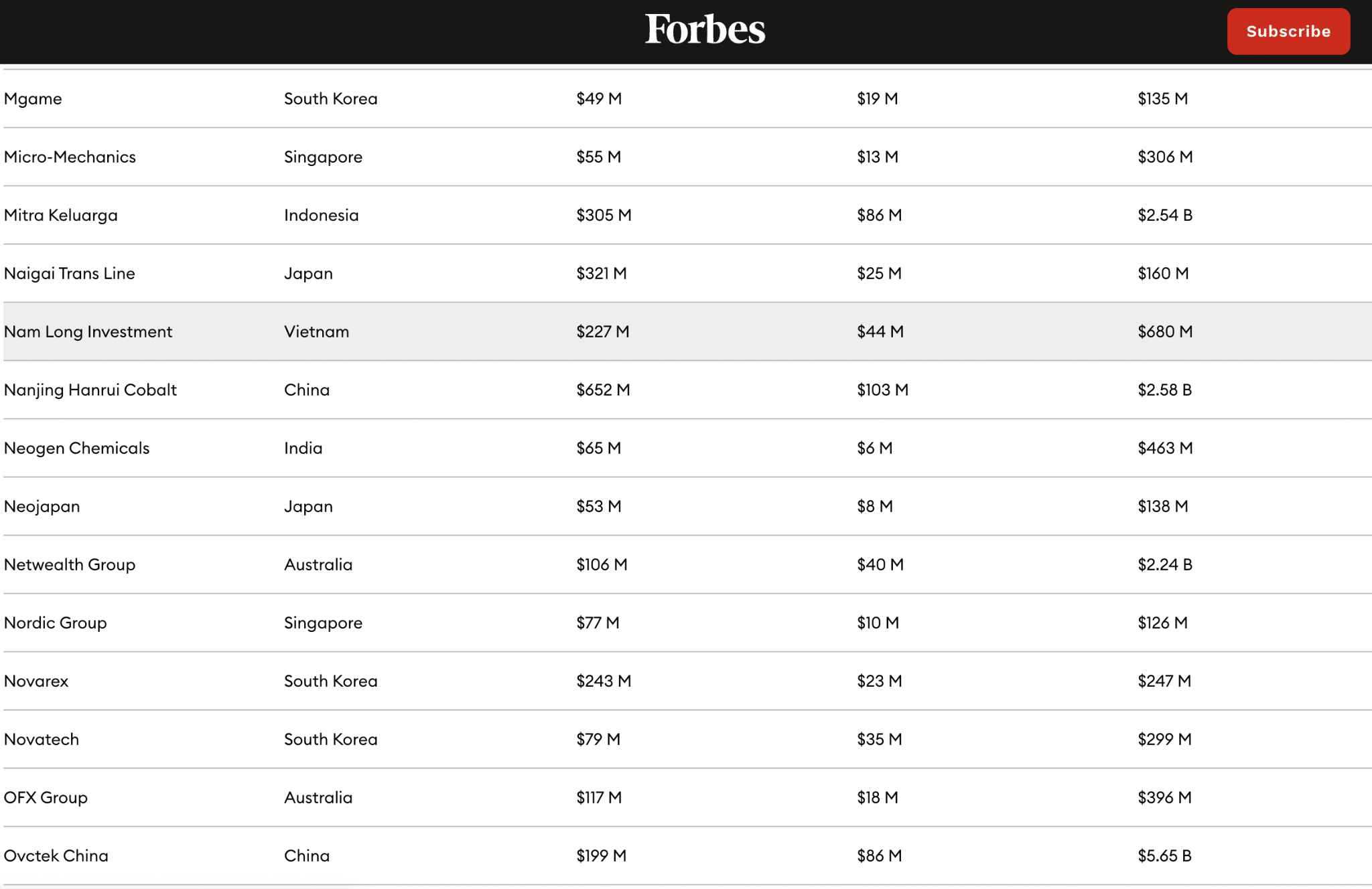 Forbes Asia mô tả Nam Long được thành lập năm 1992, có trụ sở chính tại TPHCM. Công ty nổi lên trong lĩnh vực đầu tư, phát triển bất động sản với việc xây dựng các khu đô thị khép kín, bao gồm các sản phẩm như căn hộ, biệt thự, nhà phố, văn phòng… Năm 2021, lần đầu tiên trong lịch sử hoạt động, lợi nhuận sau thuế cổ đông công ty mẹ Nam Long vượt ngưỡng nghìn tỷ đồng, doanh thu gấp 2,3 lần năm trước đó.
