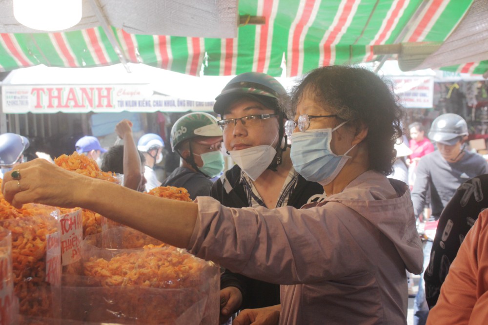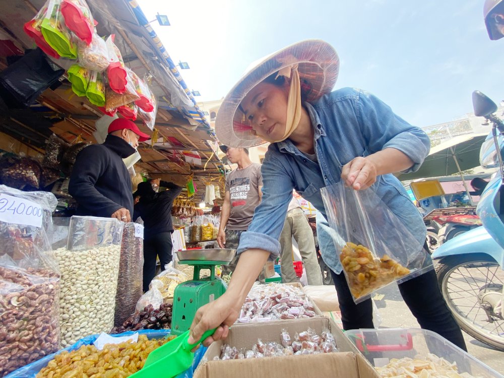 Đang là giờ trưa nhưng siêu thị Emart (Gò Vấp) vẫn đông khách hàng mua sắm. Các sản phẩm như bánh kẹo, mứt, thực phẩm chế biến sẵn… đang được nhiều khách ưu tiên lựa chọn. Nhiều mặt hàng phục vụ Tết giảm giá. Ảnh: Lê VũThời điểm này, siêu thị BigC (quận 10) vẫn cung cấp đa dạng hàng hóa từ các mặt hàng tươi sống đến các loại bánh mứt. Nhân viên trực quầy hàng cũng liên tục xếp sản phẩm lên kệ trưng bày. Ảnh: Lê VũMột khu chợ Bình Tây (quận 6) mới sáng sớm đã đông khách. Từ ngày 28 tháng Chạp, nhiều người lao động bắt đầu nghỉ Tết nên có thời gian hơn cho việc sắm sửa cho gia đình đón Xuân. Ảnh: Lê VũCác sạp hàng thực phẩm chế biến sẵn ở khu chợ Bình Tây cũng trưng bày hàng hóa số lượng lớn phục vụ nhu cầu tiêu dùng. Ảnh: Lê VũChị Loan, tiểu thương quầy bán bánh kẹo chợ Bình Tây cho biết, càng sát Tết, khách hàng ghé sạp mua bánh, kẹo đông hơn. Đến nay chị bán được hơn 70% lương thực phẩm chuẩn bị cho Tết. So với năm ngoái, sức mua có phần yếu hơn do nhiều công nhân đã về quê từ tháng trước. Số lượng hàng hóa nhập về để bán Tết Quý Mão cũng không nhiều như mọi năm. Ảnh: Lê Vũ“Tôi lựa chọn hôm nay mới đi sắm tết vì cơ quan mình làm mới được nghỉ tết từ 27 tết. Hiện tại, tôi mua thực phẩm khô trước và sẽ mua thêm 1-2 kg thịt để làm thịt kho, dồn khổ qua để có không khí tết trong nhà”, Lạc Hà, khách hàng ngụ quận 10 nói. Ảnh: Lê VũNhiều vật phẩm dùng để trang trí Tết như câu đối, hoa giấy, bao lì xì, túi đựng ghi câu chúc tết hoặc chữ thư pháp có nghĩa Lộc, Tài… cũng được bày bán nhiều tại các gian hàng. Ảnh: Lê Vũ