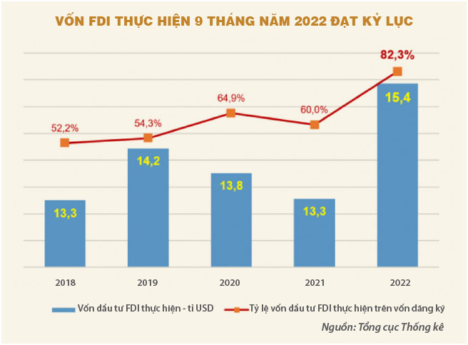Ở hoạt động đầu tư, dòng vốn đầu tư trực tiếp nước ngoài (FDI) thực hiện tại Việt Nam 9 tháng qua cũng tăng đến 16,3% so với cùng kỳ năm trước, đạt 15,43 tỉ đô la Mỹ. Đây là số vốn FDI thực hiện cao nhất của 9 tháng trong 5 năm qua. Ngoài ra, tỷ lệ vốn FDI thực hiện trên vốn đăng ký, so sánh trong giai đoạn 2018-2022, cũng cho thấy xu hướng rất tích cực của dòng vốn đầu tư này: tỷ lệ vốn thực hiện trên vốn đăng ký 9 tháng năm 2022 đạt 82,3%, là tỷ lệ cao kỷ lục.