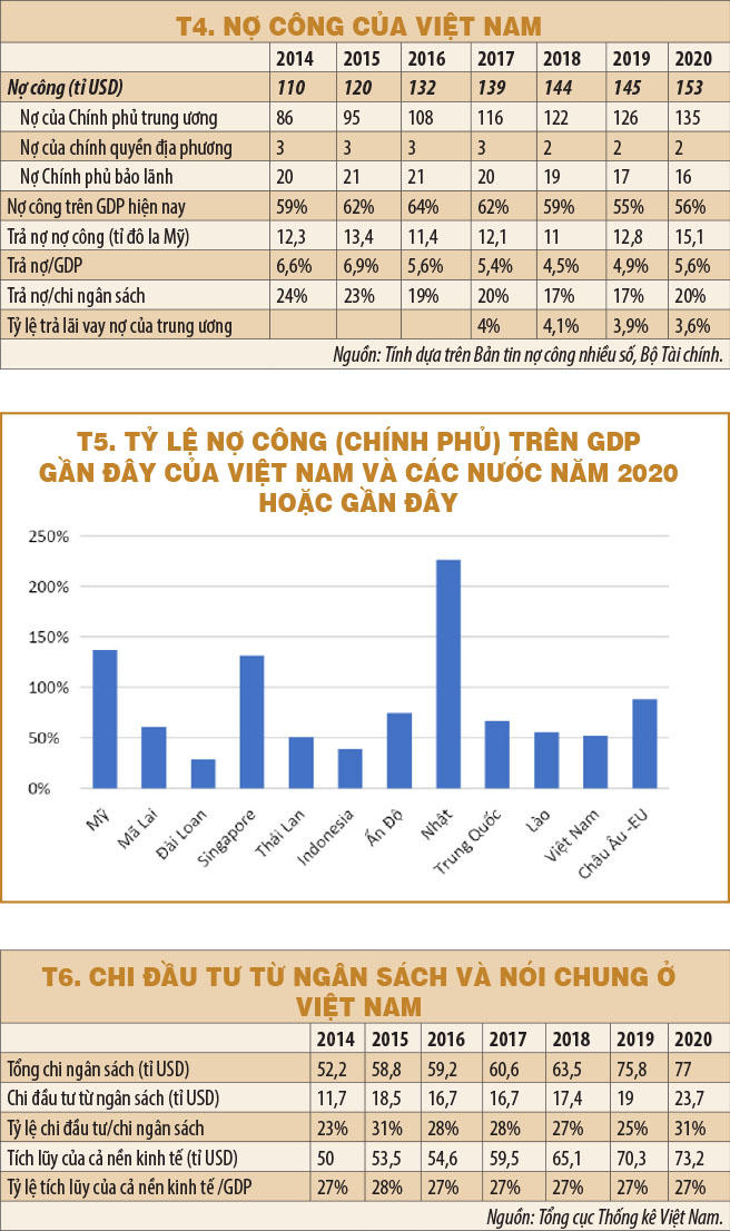 Nợ công được định nghĩa ở đây là tổng của nợ Chính phủ và nợ của doanh nghiệp được Chính phủ bảo lãnh. Nợ công ở Việt Nam năm 2020 ở mức 153 tỉ USD, bằng 56% GDP, thấp hơn so với đỉnh cao 64% GDP năm 2016 (xem bảng T4), và thấp hơn nhiều nước trên thế giới như Nhật, Mỹ, Singapore, nhưng vượt hẳn Trung Quốc (xem bảng T5). Điều đáng quan tâm là tỷ lệ chi trả nợ công từ ngân sách hàng năm. Tỷ lệ này không nhỏ, sau khi giảm từ cao điểm gần 25% đã tăng trở lại và hiện ở mức 20% (xem bảng T4).