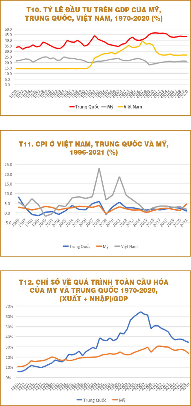 1. Sự khác biệt giữa tỷ phần GDP thế giới của Trung Quốc và của Mỹ đang ghép lại. Mỹ giảm từ 29% GDP thế giới xuống 24% trong khi đó Trung Quốc từ 1% lên 18% tính từ năm 1970 đến 2020 (xem T8). Theo dự báo của tác giả, GDP Trung Quốc sẽ bằng hoặc vượt Mỹ vào năm 2035.
