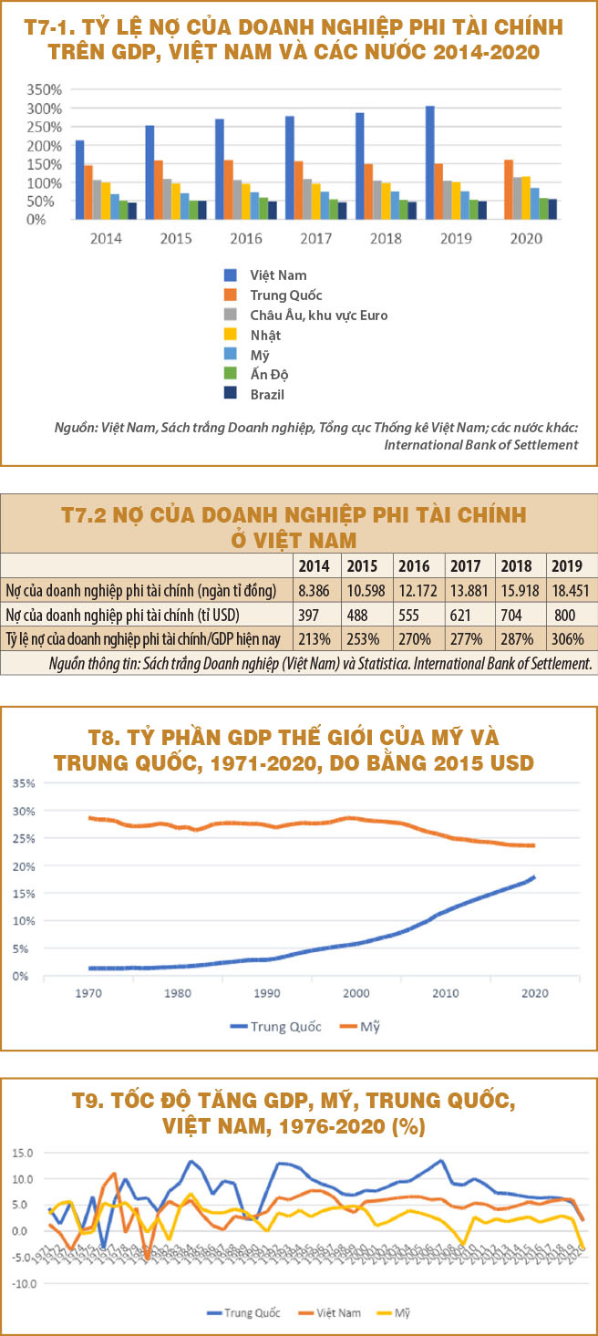 Có thể nói tỷ lệ nợ doanh nghiệp phi tài chính ở Việt Nam là có vấn đề, hiện nay (2019) ở mức hơn 305% GDP cũ, vượt xa các nước khác, kể cả Trung Quốc (153%), Nhật Bản (118%), Mỹ (81%) – là những “ổ nợ”, phải dựa vào đó để hoặc ổn định kinh tế như Nhật Bản, Mỹ hoặc nhằm đạt tốc độ tăng GDP cao như Trung Quốc (xem bảng T7-1 và T7-2). Phải chăng tăng tỷ lệ nợ của doanh nghiệp, nhất là nợ của DNNN, là nhằm tăng tốc độ tăng GDP (số liệu của Việt Nam hiện nay chưa cho phép phân chia khu vực doanh nghiệp phi tài chính thành DNNN, doanh nghiệp FDI và tư nhân trong nước) hoặc giảm trả thuế lợi tức (như ở Mỹ)?