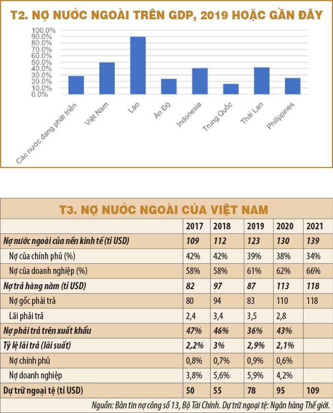 Nợ nước ngoài của Việt Nam còn đáng lo vì chiếm phần lớn là nợ của doanh nghiệp. Năm 2021, nợ gốc phải trả là 118 tỉ USD, cao hơn cả dự trữ ngoại tệ 109 tỉ USD (xem bảng T3). Có thể có hai lý do: tỷ lệ nợ nước ngoài của doanh nghiệp ngày càng lớn, hiện chiếm đến 66% (xem bảng T3), và có thể chủ yếu là nợ ngắn hạn cần trả ngay.