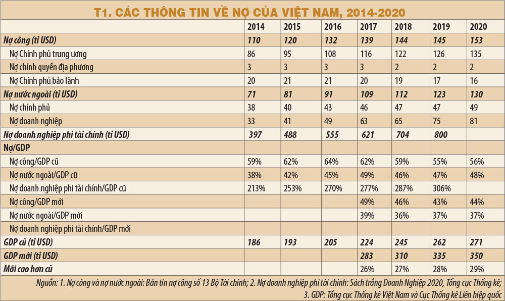 Nợ nước ngoài năm 2020 là 130 tỉ đô la Mỹ (USD) và năm 2021 ước đoán là 139 tỉ USD, bằng 47-48% GDP, tăng lên nhiều so với mức 38% GDP năm 2014. Mới đây, Tổng cục Thống kê đưa ra số liệu mới về GDP cao hơn tính toán trước là 26-29%, và do đó làm giảm tỷ lệ nợ trên (xem bảng T1).