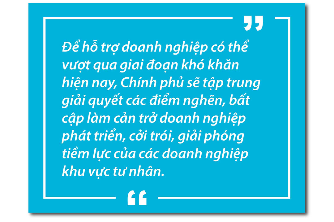 Để hỗ trợ doanh nghiệp có thể vượt qua giai đoạn khó khăn hiện nay, Chính phủ sẽ tập trung giải quyết các điểm nghẽn, bất cập làm cản trở doanh nghiệp phát triển, cởi trói, giải phóng tiềm lực của các doanh nghiệp khu vực tư nhân. Đồng thời đổi mới các chính sách, chương trình hỗ trợ doanh nghiệp đảm bảo phù hợp với nhu cầu thực tế của doanh nghiệp và thị trường.