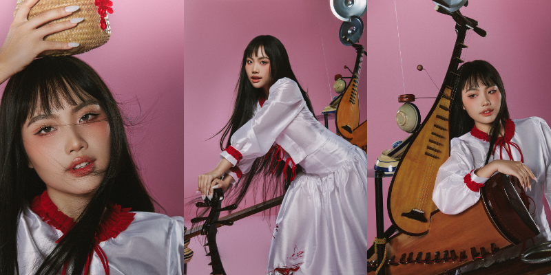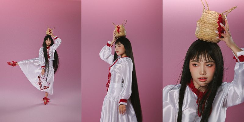 Bộ ảnh với gam màu đỏ – trắng mang đặc trưng phong cách Á Đông. Không màu mè, giọng ca vàng trong làng dân ca diện váy và áo được thiết kế cách điệu, phần cạp cao ở váy tạo sự thon gọn cho vòng eo, điểm xuyết bằng các chi tiết màu đỏ nổi bật và họa tiết con cò truyền thống được thêu tỉ mỉ. Chất liệu văn hóa dân gian Việt Nam còn được Phương Mỹ Chi thể hiện rõ nét khi kết hợp cùng giày đỏ lấy cảm hứng từ đôi hài của cô Tấm trong truyện cổ tích. Bên cạnh đó, các “phụ kiện” đi kèm cũng là yếu tố quan trọng giúp nữ ca sĩ thể hiện tình yêu văn hóa truyền thống như giỏ mây, chén gốm, song lang, đàn bầu, đàn tranh, đàn tỳ bà,…