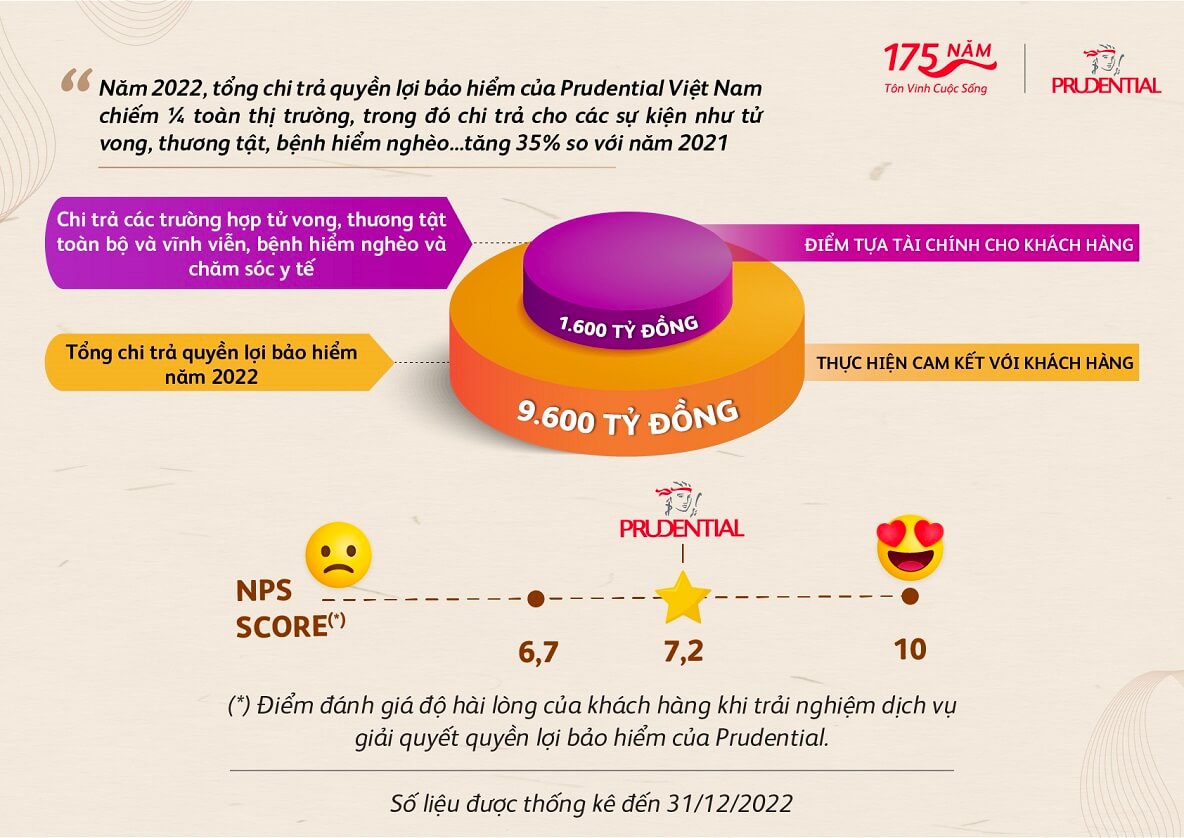 Năm 2022, Prudential đã thực hiện chi trả hơn 1.600 tỉ đồng quyền lợi bảo hiểm gồm quyền lợi tử vong, thương tật toàn bộ và vĩnh viễn, bệnh hiểm nghèo và chăm sóc y tế, tăng 35% so với năm 2021. Theo đó, trong năm 2022, Prudential tiếp tục thực hiện cam kết là điểm tựa tài chính cho 2,1 triệu khách hàng với tổng số tiền chi trả bảo hiểm đạt xấp xỉ 9,600 tỉ đồng, tăng 11% so với năm 2021 chiếm ¼ toàn thị trường bảo hiểm nhân thọ tại Việt Nam.