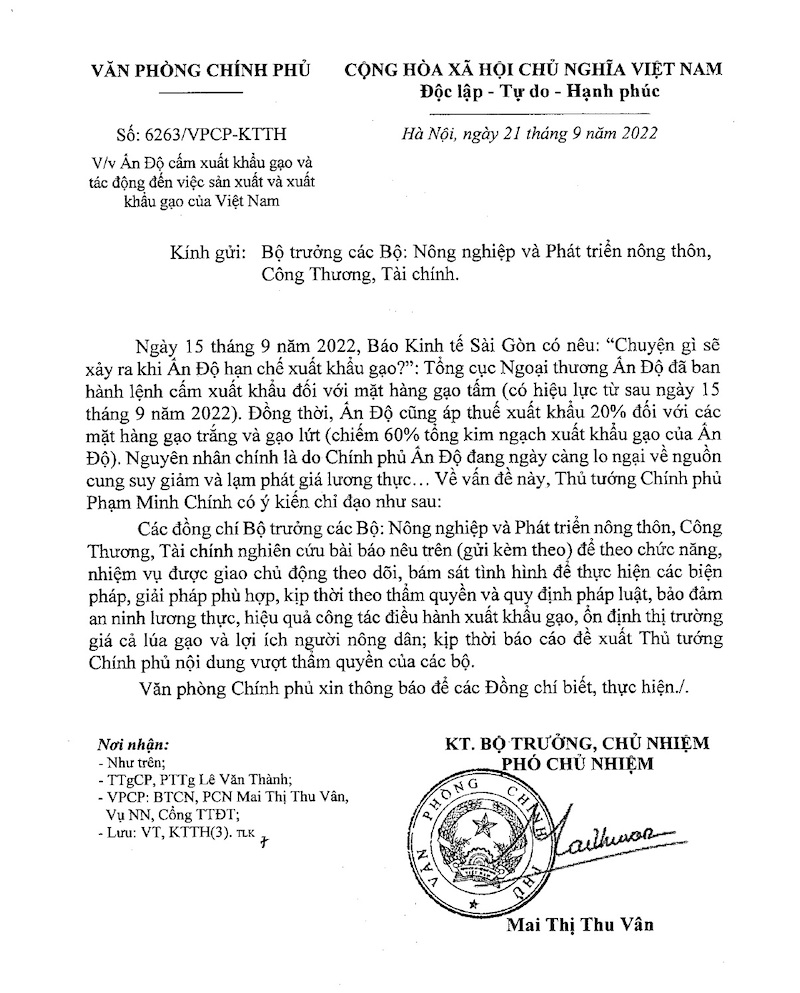 (KTSG Online) – Văn phòng Chính phủ vừa có công văn 6263/VPCP-KTTH ngày 21-9-2022 về việc Ấn Độ cấm xuất khẩu gạo và tác động đến việc sản xuất và xuất khẩu gạo của Việt Nam. Trong công văn này, Thủ tướng yêu cầu các bộ liên quan nghiên cứu việc Ấn Độ cấm xuất khẩu gạo và có giải pháp ổn định thị trường giá cả lúa gạo và bảo đảm lợi ích người nông dân.