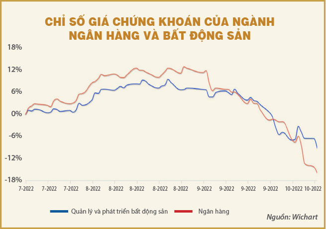 Vào tuần đầu tháng 9, khi thị trường xấu chung thì việc giảm giá của cổ phiếu ngân hàng cũng không tạo ra nghi ngờ gì, vì tỷ trọng của ngành ngân hàng cũng khá lớn trong chỉ số VN-Index. Tuy nhiên những ngày sau đó thì tốc độ giảm của ngành ngân hàng dường như bị mất kiểm soát. So với thời điểm cao nhất gần nhất, chỉ số của ngành ngân hàng giảm 33,4% trong khi VN-Index giảm 23,4%.