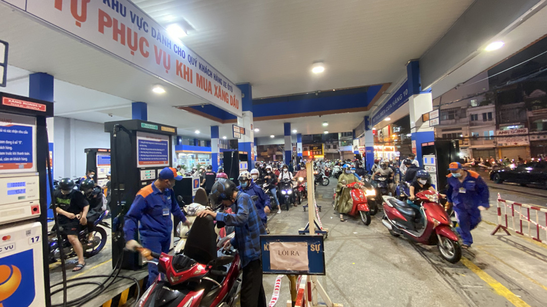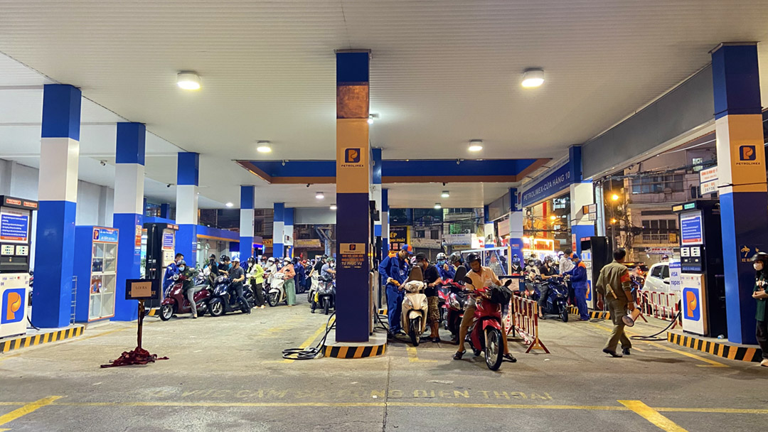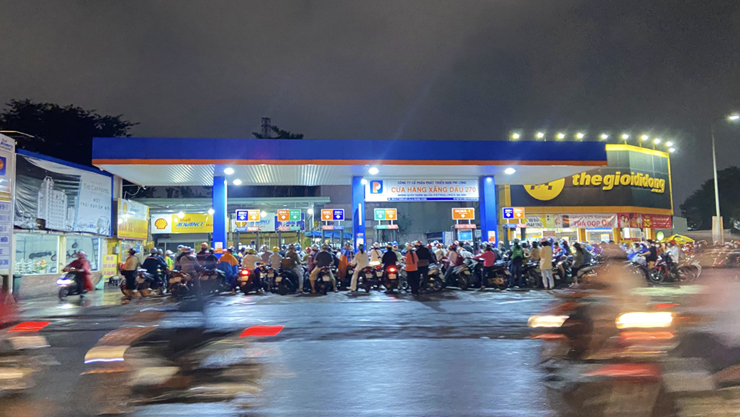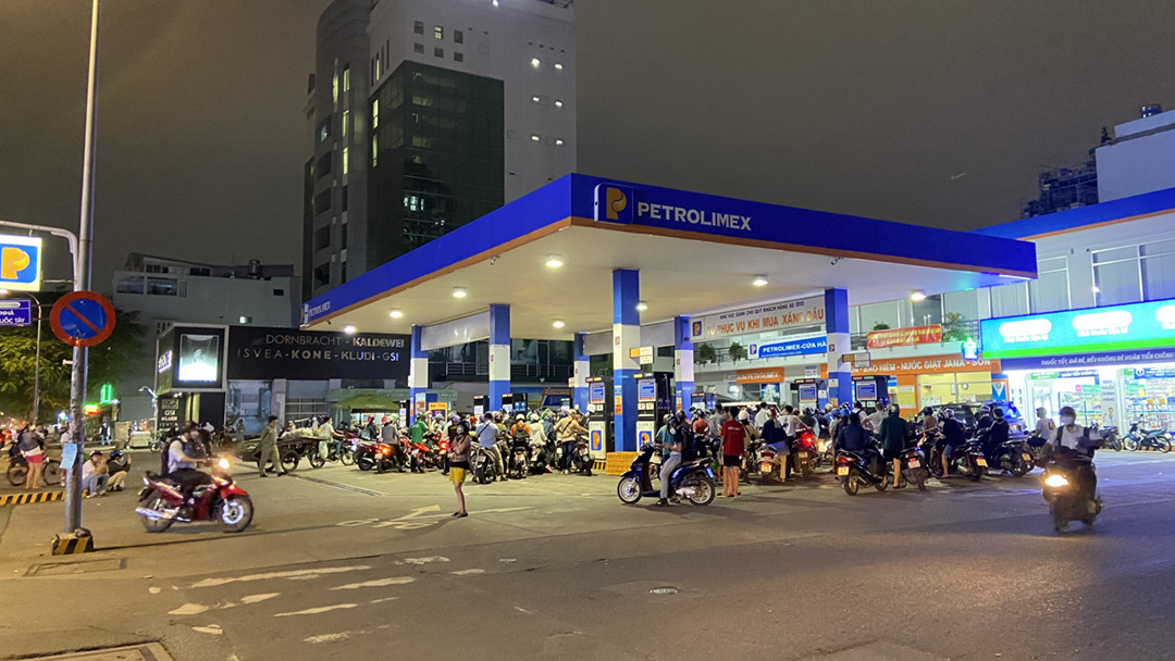 (KTSG Online) – Báo cáo của Cục Quản lý thị trường TPHCM vào chiều 10-10 cho biết thành phố đã có đến 121 cửa hàng hết xăng tạm thời trong tổng số 550 cửa hàng kinh doanh xăng dầu trên địa bàn. Do nguồn cung giảm, tối 10-10, nhiều người dân phải xếp hàng dài trước các cửa hàng xăng dầu hiện còn kinh doanh để chờ đến lượt mua.