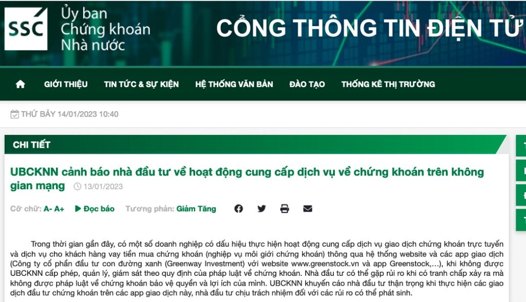 Thông báo của Ủy ban Chứng khoán Nhà nước (UBCKNN) cho biết, trong thời gian gần đây, có một số doanh nghiệp có dấu hiệu thực hiện hoạt động cung cấp dịch vụ giao dịch chứng khoán trực tuyến và dịch vụ cho khách hàng vay tiền mua chứng khoán (nghiệp vụ môi giới chứng khoán) thông qua hệ thống website và các app giao dịch của Công ty cổ phần Đầu tư con đường xanh (Greenway Investment) với website www.greenstock.vn và app Greenstock… khi không được UBCKNN cấp phép, quản lý, giám sát theo quy định của pháp luật về chứng khoán.