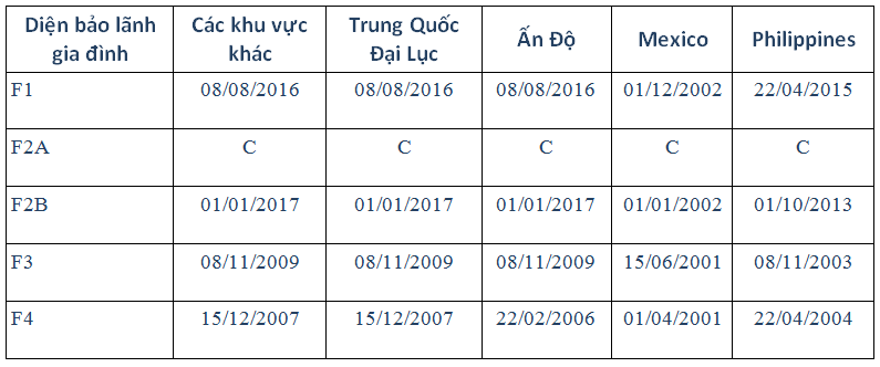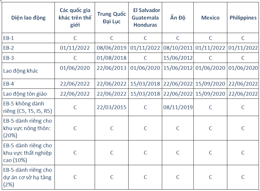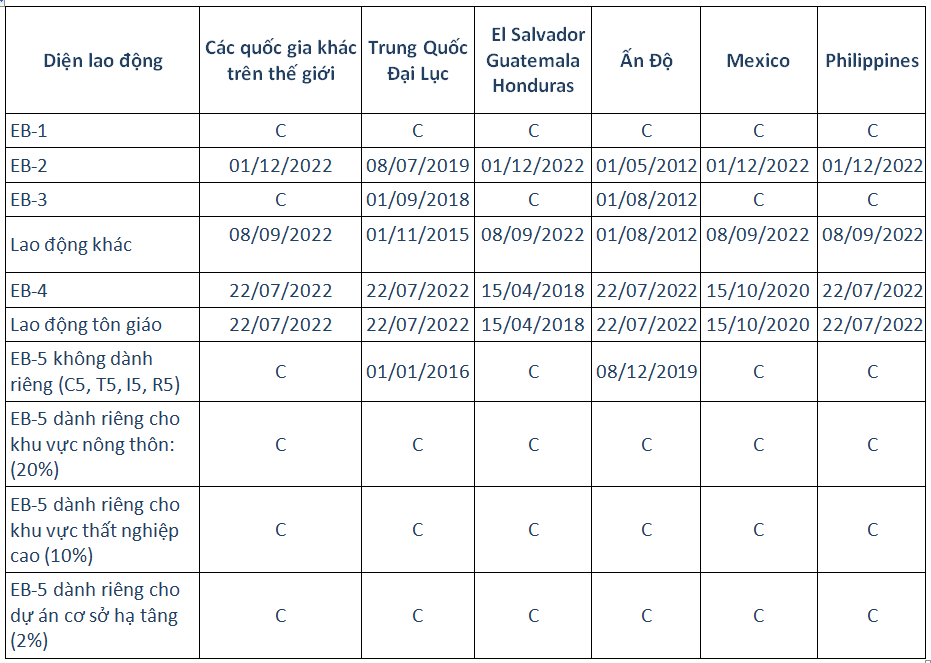• Lao động EB-3 diện lao động phổ thông (trong bảng là Lao động khác), EB-4 và Lao động tôn giáo đã backlog trên toàn thế giới.
