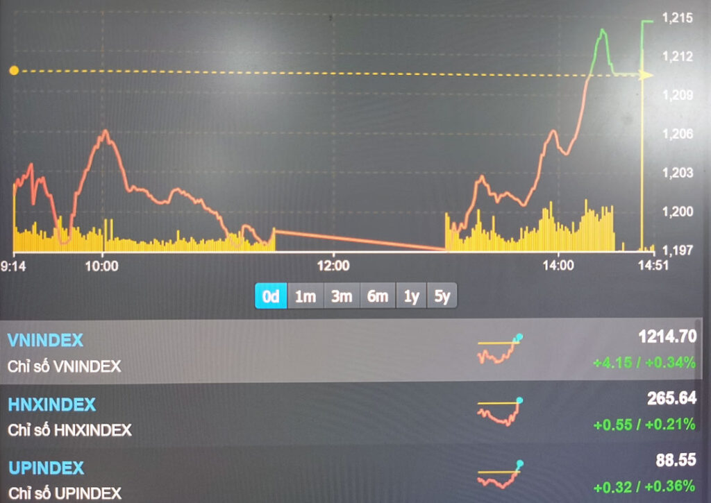 Kết phiên, chỉ số VN-Index tăng 4,15 điểm, tương ứng tăng 0,3%, lên mức 1,214.7 điểm; còn chỉ số HNX-Index tăng 0,2%.